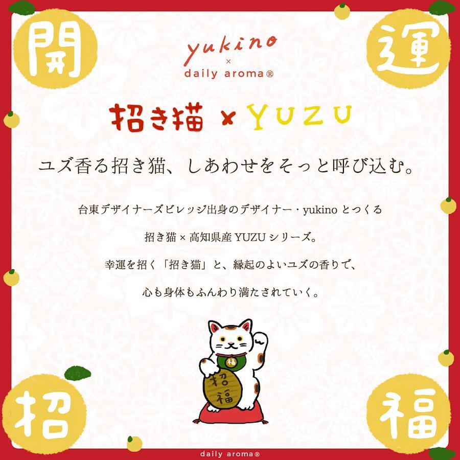台東デザイナービレッジ出身デザイナーのyukinoによる招き猫×ユズの香りのシリーズ。幸運を招く「招き猫」と縁起のよいユズの香りで心も身体も満たされる、天然ユズ精油100%のみずみずしく爽やかな香りが広がる入浴剤です。