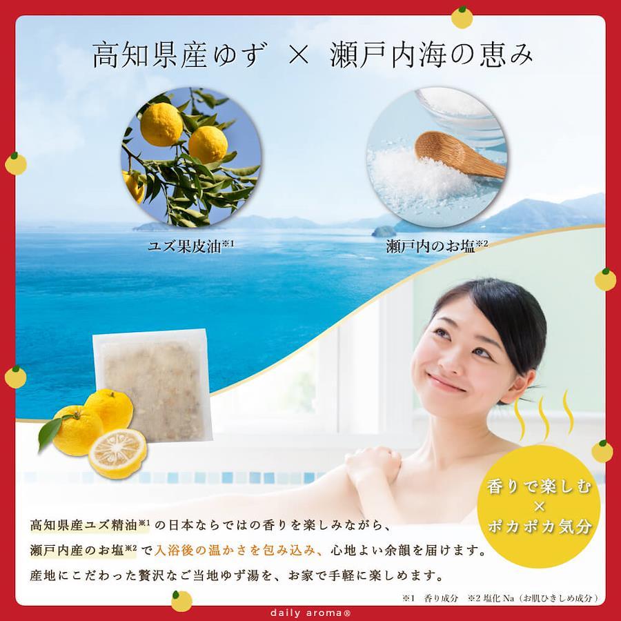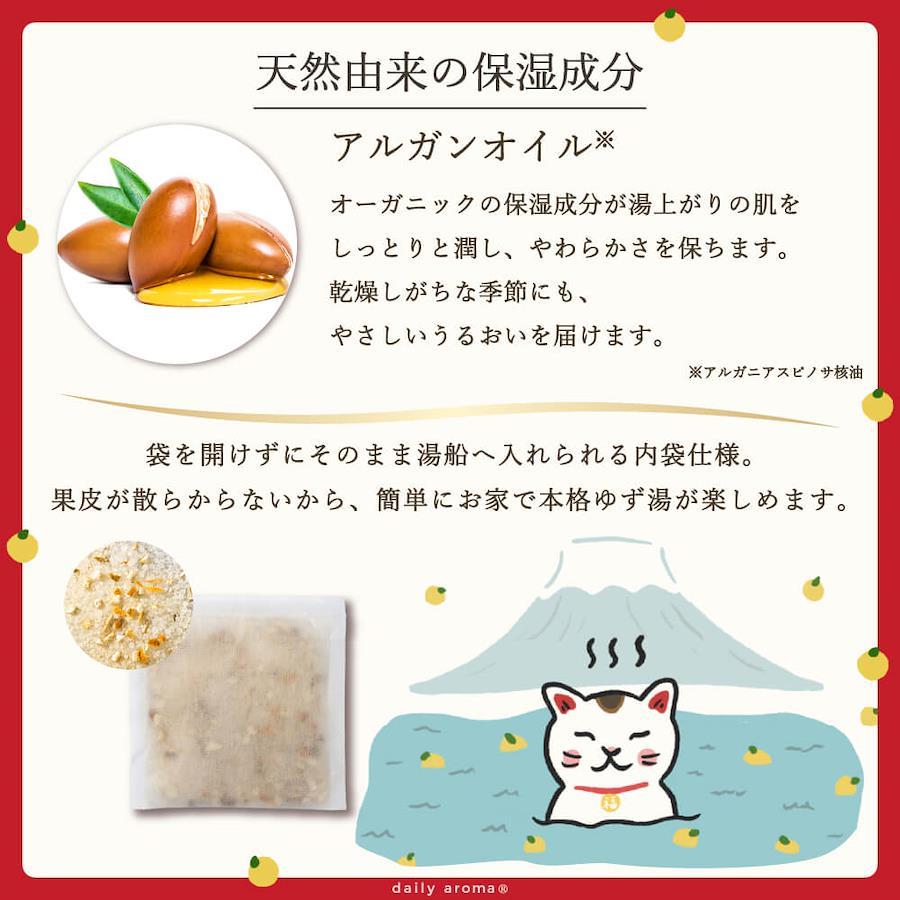4種の美肌成分*で肌しっとり、おみくじ付きで心までほころぶバスタイム。袋を開けずにそのまま湯船へ入れられる内袋仕様。果皮が散らからず、簡単にお家で本格ゆず湯が楽しめます。
