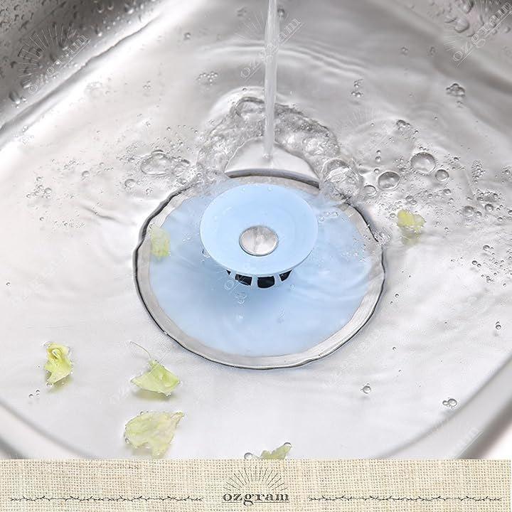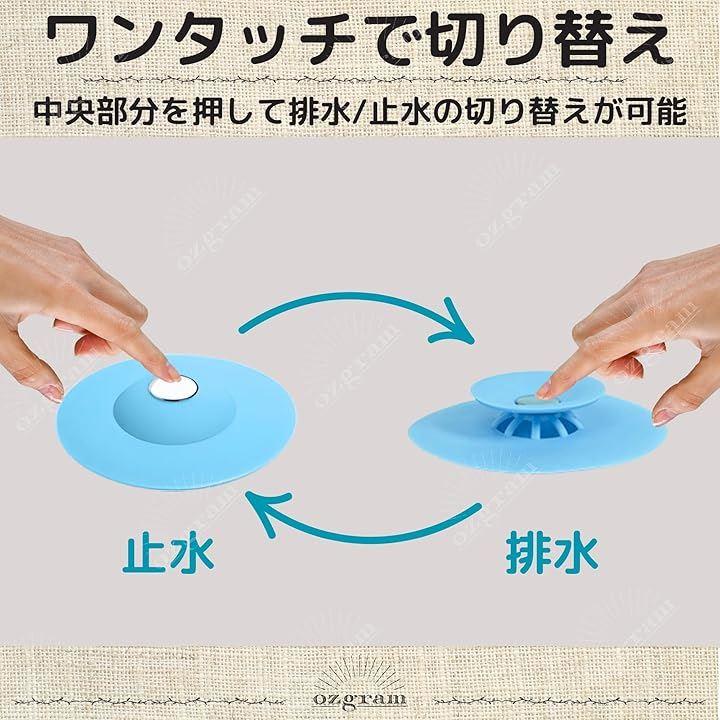「止水と排水をワンタッチで切替」 シリコン素材の本体は柔軟性と耐久性に優れており中央を押すだけで排水/止水の切り替えが行えます。