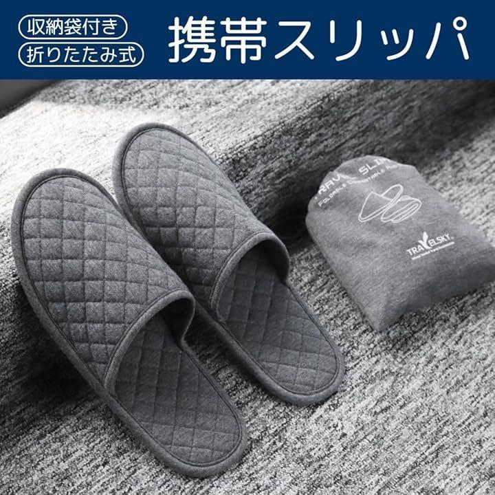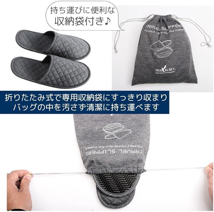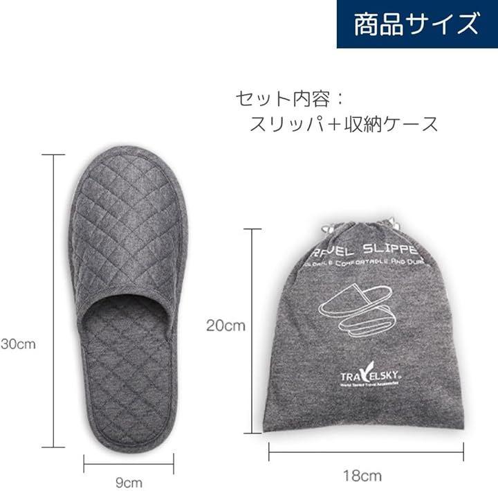「商品詳細」セット内容:スリッパ+収納ケース サイズ:(本体)28cm x 11cm (かかと部分の幅)8cm (収納ケース)20cm x 15cm カラー:ブラック/グレー
