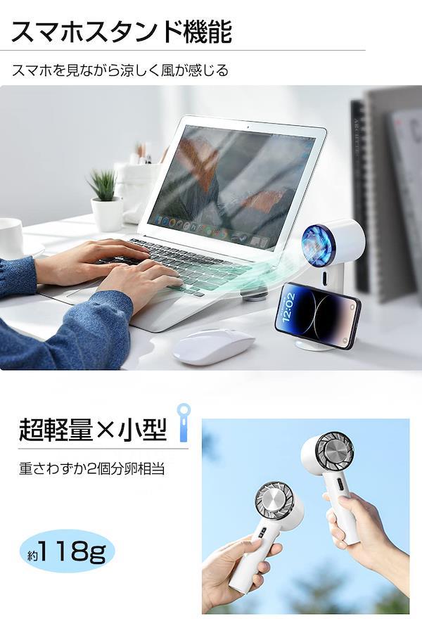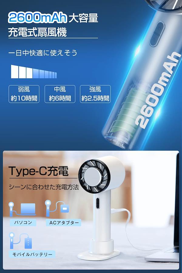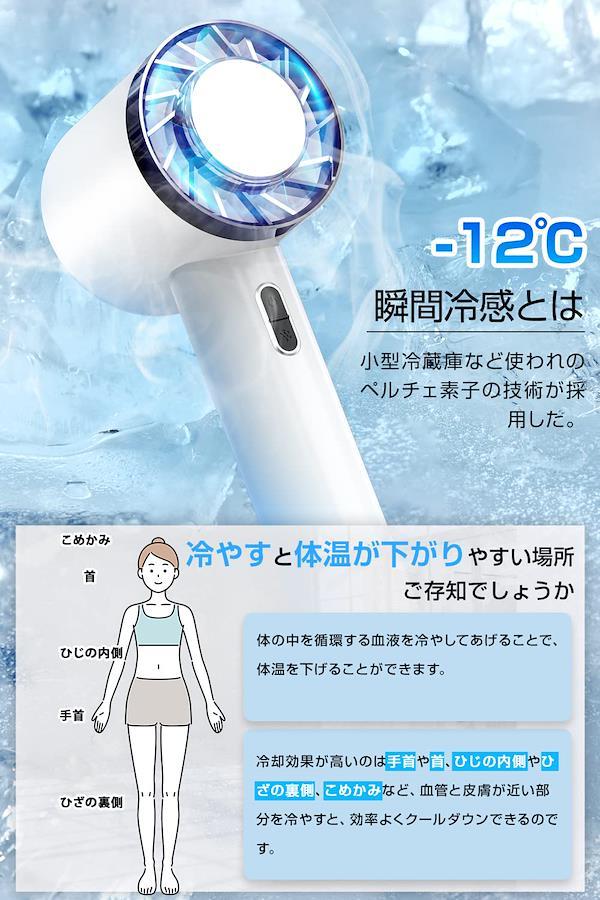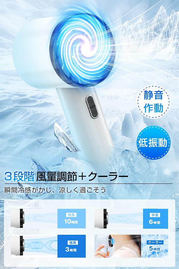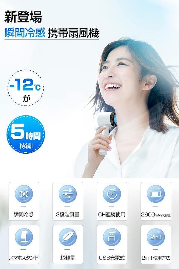 3営業日以内に発送≪新品未開封品≫:【2023年新登場瞬間冷却・先端半導体技術・携帯扇風機】この携帯扇風機しいトレンドを導く半導体冷却交換技術を採用し、接触瞬間超冷感、体感温度が-12℃下がります。冷却部を頬に当ててください、快適な冷感を瞬間感じます。今年の猛暑に欠かせないアイテムです。【超軽量・小型・持ち運び扇風機】超コンパクトサイズなハンディファンに、重さわずか118gの超軽量扇風機で、手持ちで使うのはもちろん、カラビナフックでバッグに引っ掛けるとぶら下げながら持ち運べます。さらに、カラビナがスタンドにも変身して卓上扇風機として使用すると、テレワークや勉強中にも涼しい風が楽しめならが、あらゆるシーンで大活躍できる 卓上扇風機 です。【充電式usb扇風機・3段階風量】2600mAh大容量バッテリーを内蔵し、モバイルバッテリーやパソコン、USB充電器に接続すれば使えるUSB充電式扇風機です。約3時間で満タンになり、最大10時間(弱モード)連続送風可能、風量は弱・中・強3段階あり、電源ボタンを押すだけで簡単に切り替えられます。暑苦しい真夏でも冷房の設定温度を少し高くして、卓上扇風機と併用することで節電になるし、効率的に