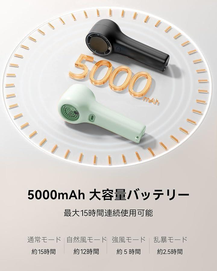 「Usb充電式・72時間連続使用可能」5000mAhバッテリーを内蔵したこのusb扇風機は、モバイルバッテリーやパソコン、USB充電器に接続して充電できます。