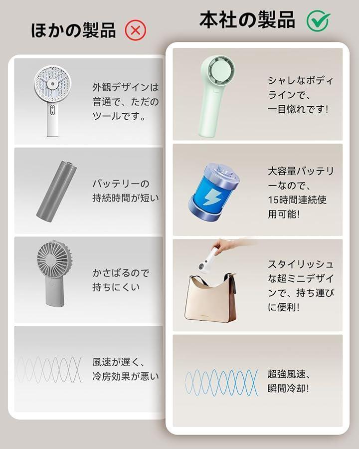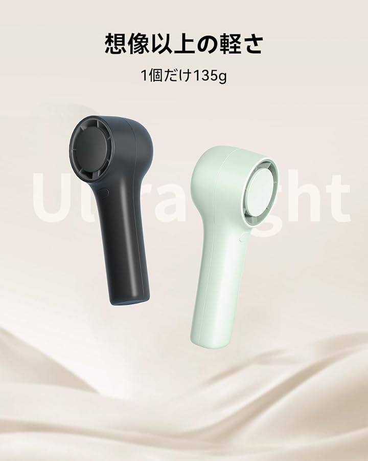 「わずか126g・超軽量持ち運びハンディ扇風機」この手持ち扇風機は、絶妙なコーンサイズのデザインと超ミニボディにより、バッグに最適です。
