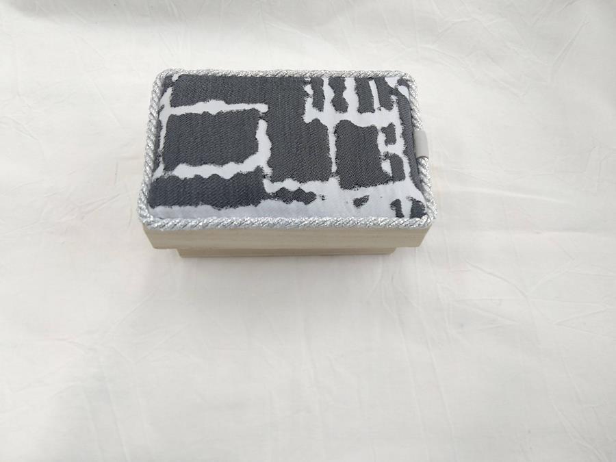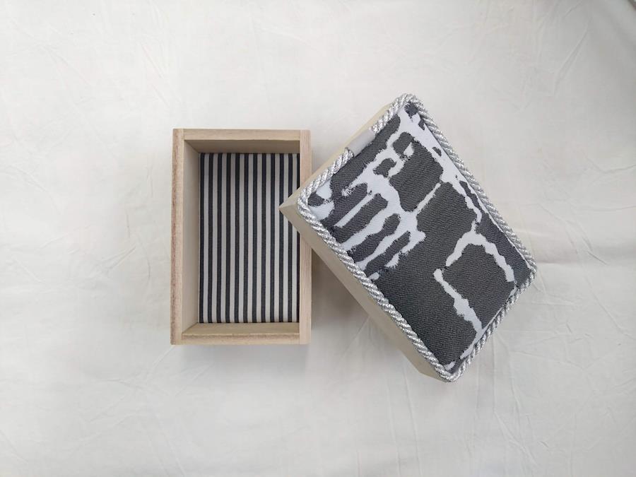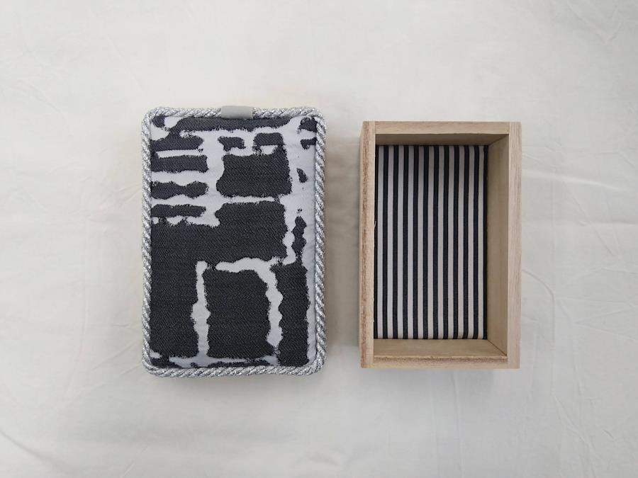 桐の箱に播州織ジャカード生地をあしらった小物入れです。桐材は通気性が良く、美しい播州織をあしらうことでインテリアとしても空間に映えます。この桐箱にアクセサリーや小さなお菓子などを入れて、ギフトBOXとしてプレゼントするのも素敵です。