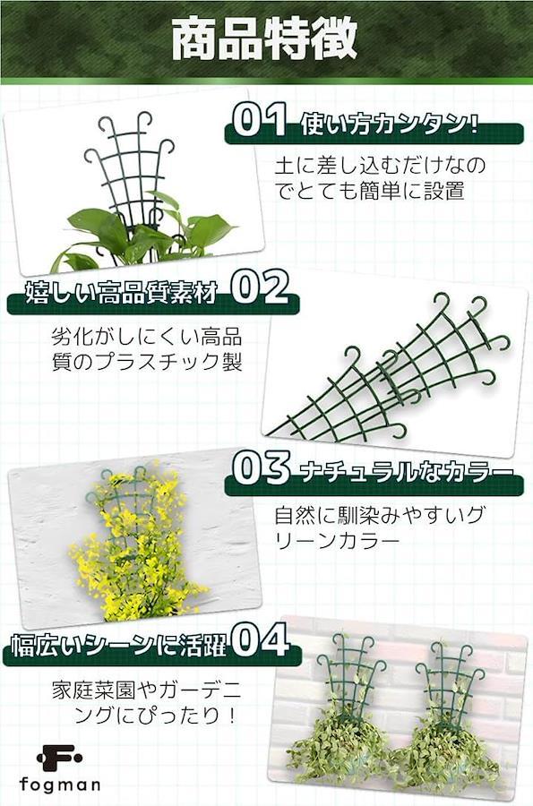 「商品特徴」(1)使い方カンタン.:土に差し込むだけなのでとても簡単に設置/(2)嬉しい高品質素材:劣化がしにくい高品質のプラスチック製/(3)ナチュラルなカラー:自然に馴染みやすいグリーンカラー/(4)幅広いシーンに活躍:家庭菜園やガーデニングにぴったり。