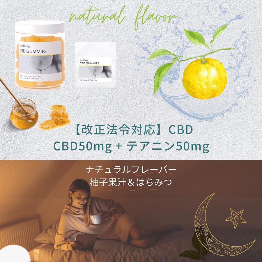 ・原材料名/水飴(国内製造)、てんさい糖、ゼラチン、イソマルトオリゴ糖、ゆず果汁、はちみつ、有機ココナッツオイル、テアニン、調味料(有機酸)、カンナビジオール、粉末オブラート、澱粉/ソルビトール、酸味料(クエン酸)、香料、乳化剤、野菜色素、光沢剤、(一部にゼラチン大豆を含む)