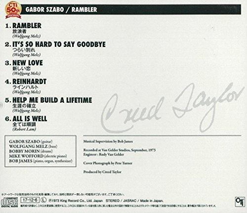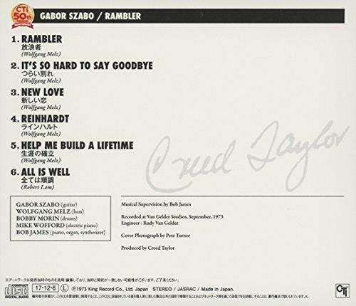 通常1-5営業日で発送:内容紹介 【商品番号:KICJ-2571】 ≪CTI創設5周年 特別企画全4タイトル同時発売! ! ≫ 1973年発売。ハンガリー出身のギタリスト“ガボール・ザボ"によるCTI2作目。 異色のメンバーと作り上げたジャズ・ファンクアルバム。 録音:1973年9月 ヴァン・ゲルダー・スタジオ 1.放浪者 2.つらい別れ 3.新しい恋 4.ラインハルト 5.生涯の確立 6.全ては順調 GABOR SZABO (guitar) WOLFGANG MELZ (bass) BOBBY MORIN (drums) MIKE WOFFORD (electric piano) BOB JAMES (piano, organ, synthesizer) 【CTI創設5周年 特別企画!!】 ◆“5:1 プレゼント・キャンペーン"開催!!◆ 217.12.6発売 全4タイトルの中より 5枚ご購入の方はこちらのシリーズ4タイトル(KICJ-2561~2598対象)の中から お好きなタイトル1枚をプレゼント! ! 応募締切は218年5月末日(当日消印有効) *詳しい応募要