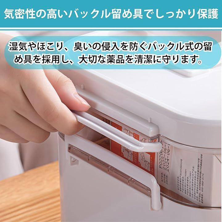 「気密性の高いバックル留め具でしっかり保護」湿気やほこり、臭いの侵入を防ぐバックル式の留め具を採用し、大切な薬品を清潔に守ります。