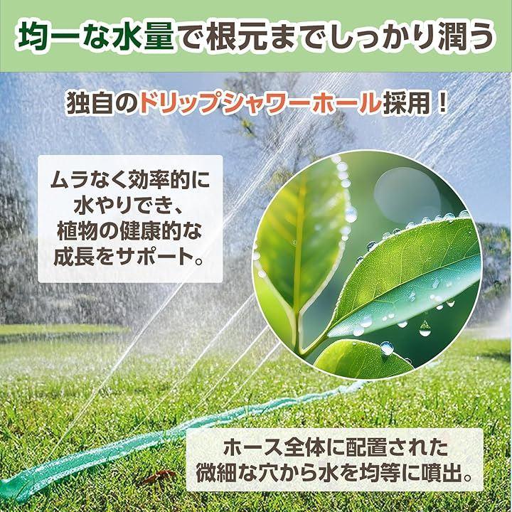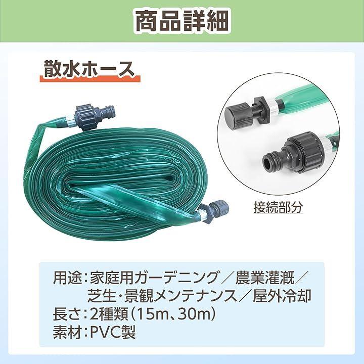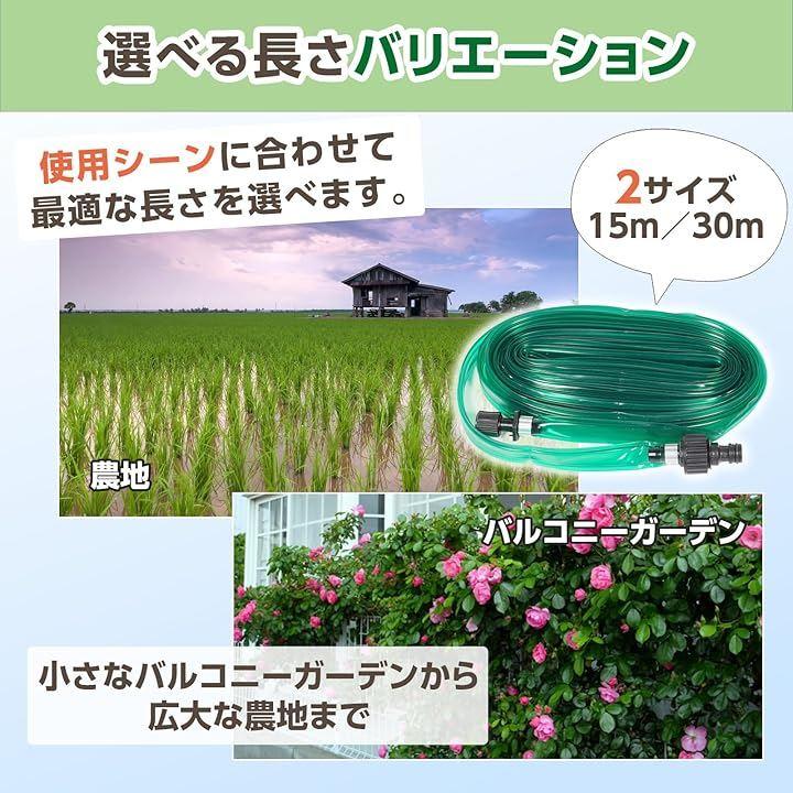 商品詳細 用途:家庭用ガーデニング/農業灌漑/芝生・景観メンテナンス/屋外冷却 長さ:15m、30m 特徴:環境にやさしい素材・高耐久・柔軟性・ドリップ散水設計