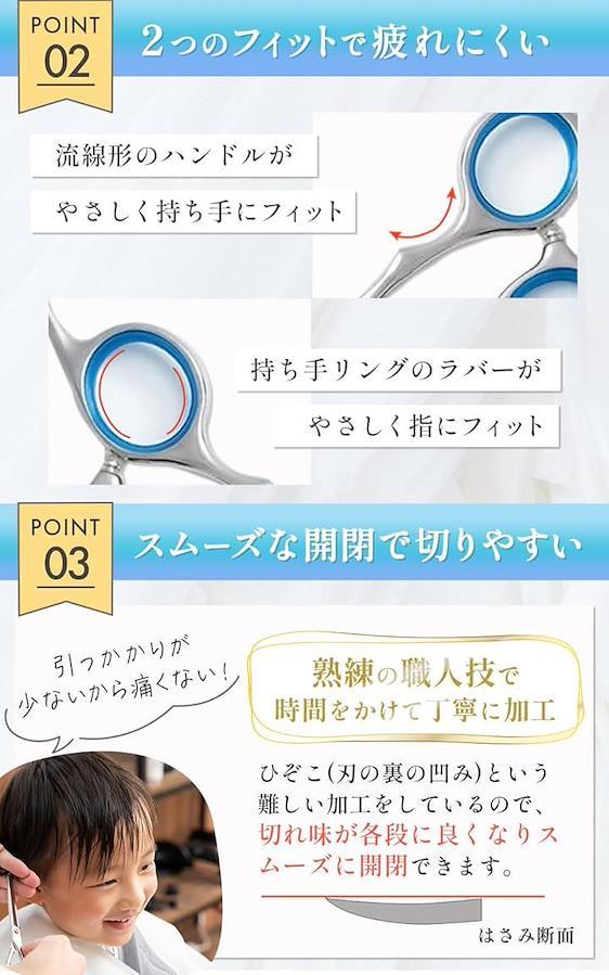 切れ味が抜群なので散髪にかかっていた時間も短縮できます。・すきばさみ熟練の職人技術でクシ刃をひとつひとつ丁寧に研磨。