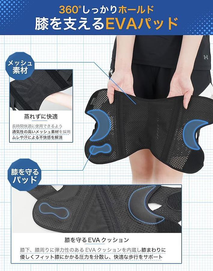 EVA素材は軽量かつ弾力性があり、膝まわりにやさしくフィットします。