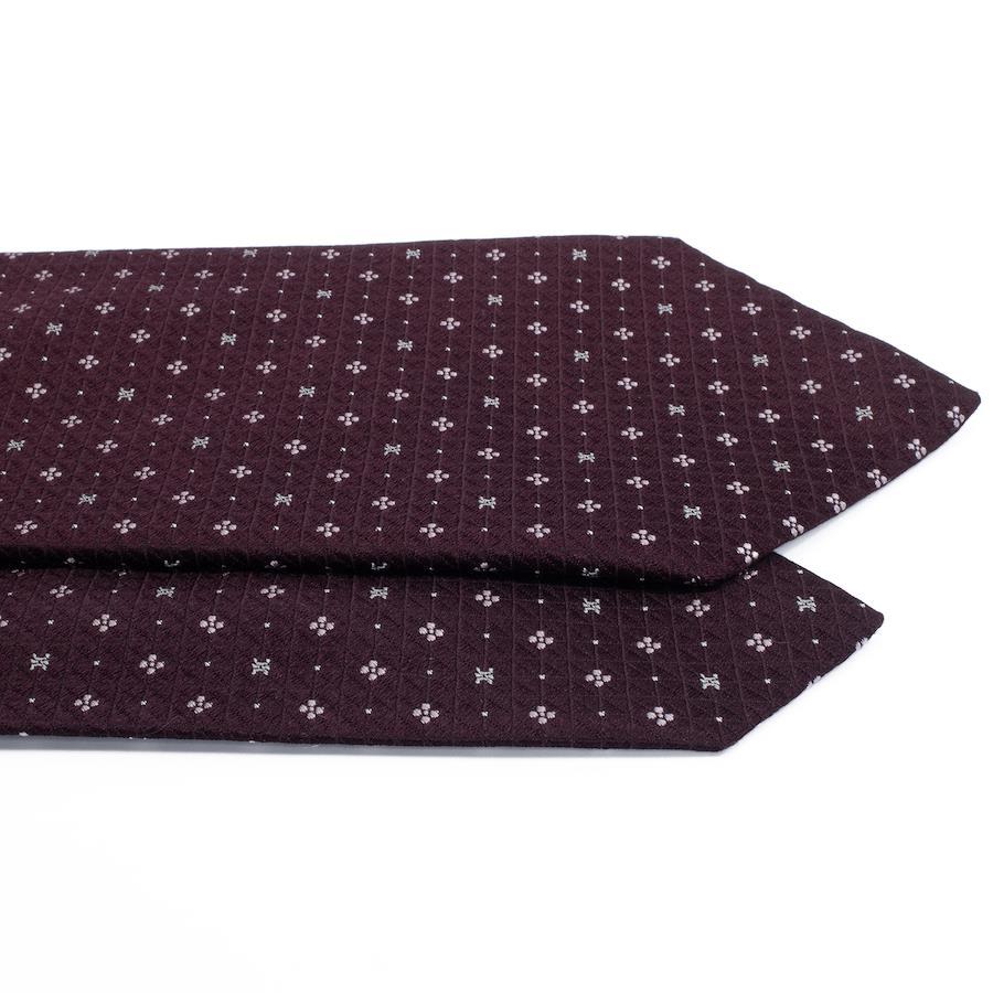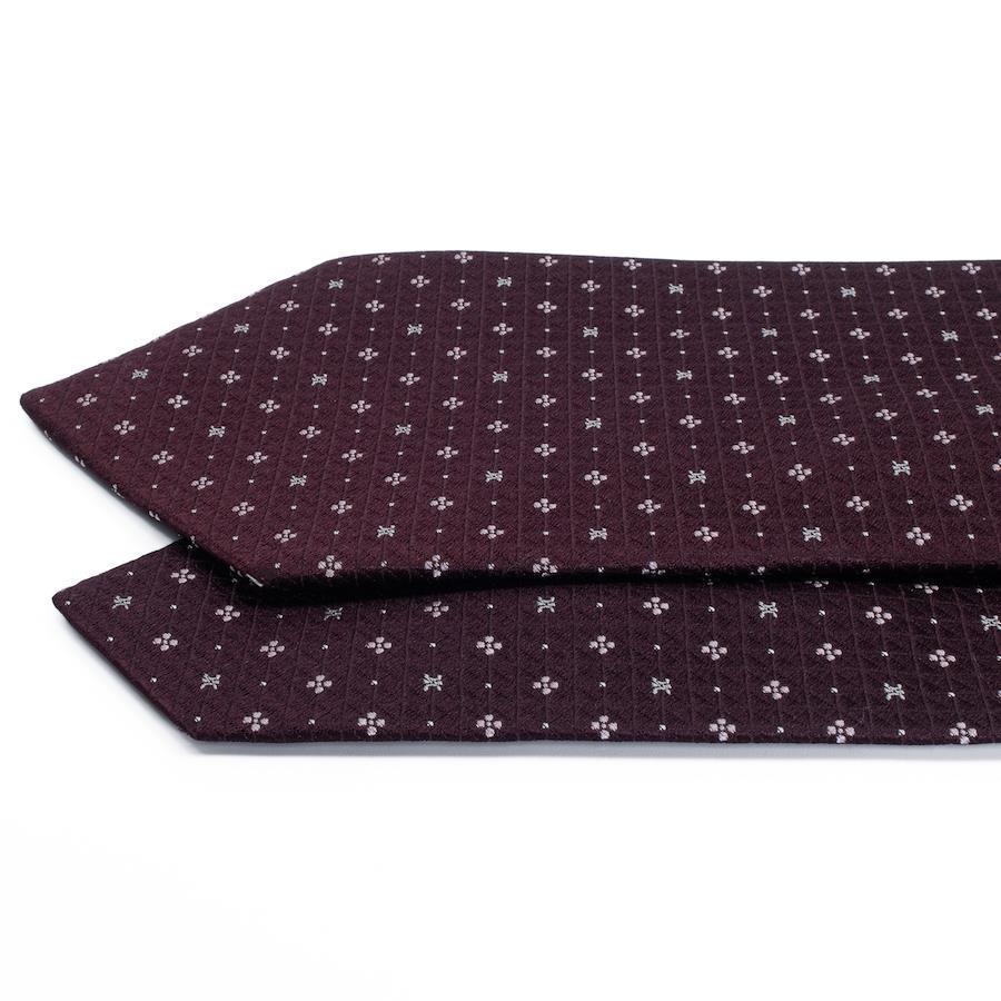 深みのあるワインレッドにシルバーの小紋柄が散りばめられ、胸元に華やかさと知的な印象を与えます。