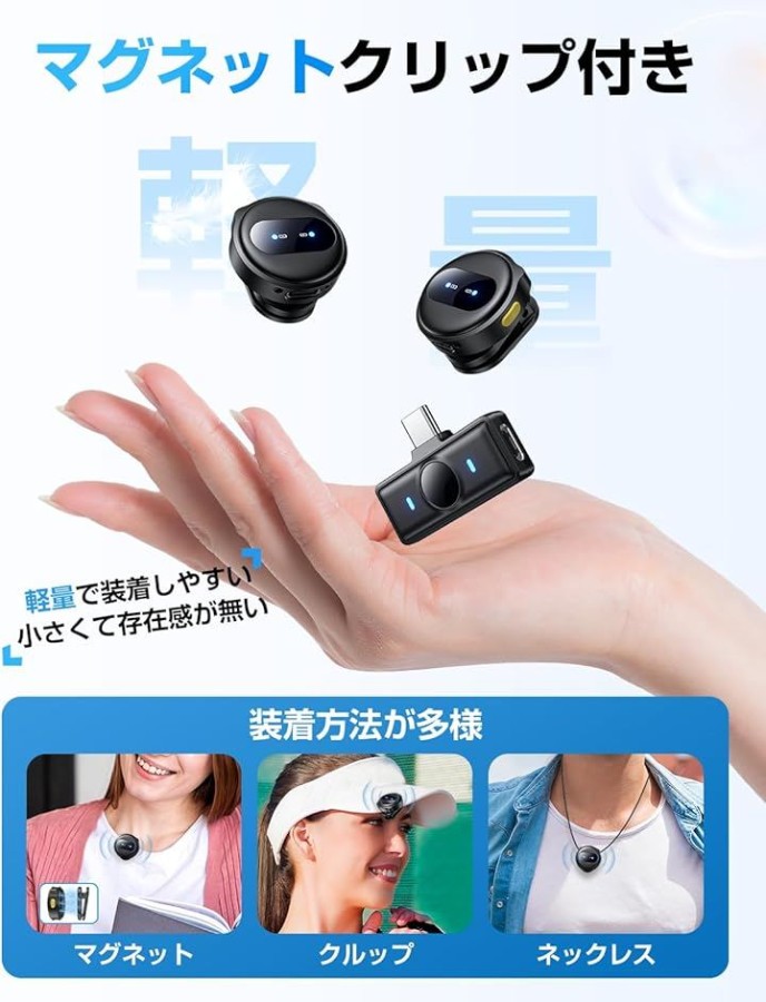 「多様なシーンへの適応性&幅広い互換性」ワイヤレスピンマイクを手に持ったり、襟元にクリップで挟め、従来の有線マイクの制約から解放されます。