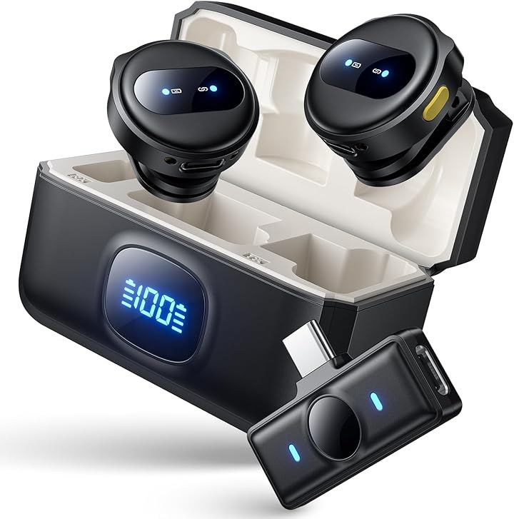 New Wireless Pin Microphone for iPhone/iPad/Android/PC, Simultaneous Use by Two Users, Instant Connection, 360° Sound Pickup, 24-Hour Battery Life, Charging Case Included, 50m Transmission Range, Ultra-Mini, Lightweight, Magnetic Design, Certified with Technical Standards Compliance Mark.