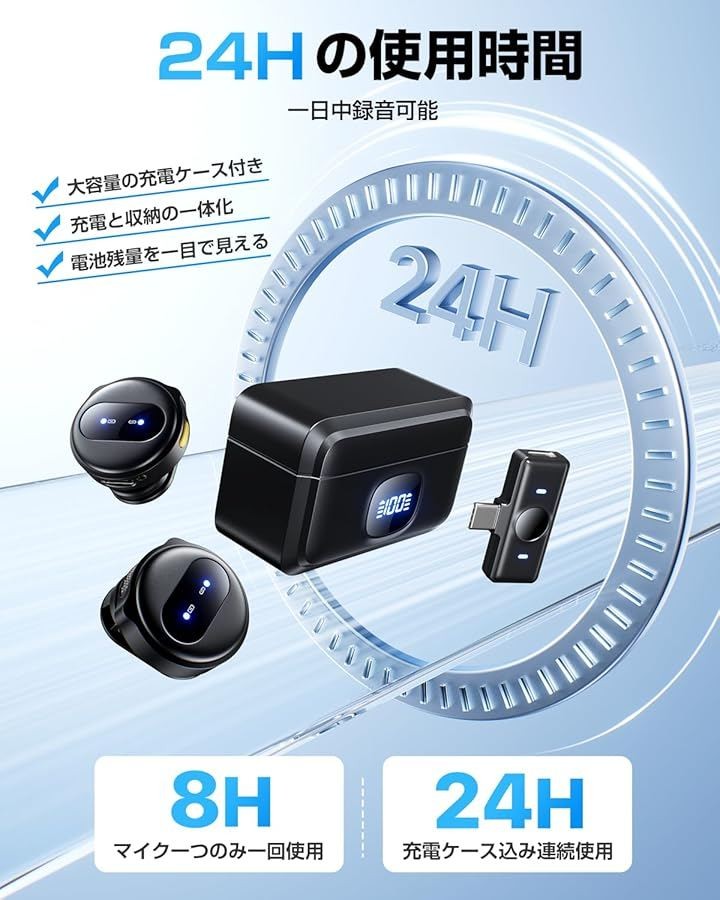 このワイヤレスピンマイクは、頻繁な充電の手間を省くだけでなく、ユーザーが安心して録音を続けられるよう設計されています。
