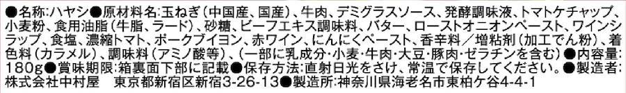 玉ねぎ(中国産、国産)、牛肉、デミグラスソース、発酵調味液、トマトケチャップ、小麦粉、食用油脂(牛脂、ラード)、砂糖、ビーフエキス調味料、バター、ローストオニオンペースト、ワインシラップ、食塩、濃縮トマト、ポークブイヨン、赤ワイン、にんにくペースト、香辛料/増粘剤(加工でん粉)、着色料(カラメル)、調味料(アミノ酸等)、(一部に乳成分・小麦・牛肉・大豆・豚肉・ゼラチンを含む)