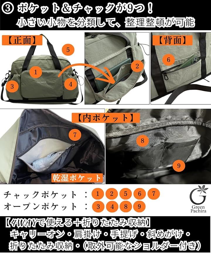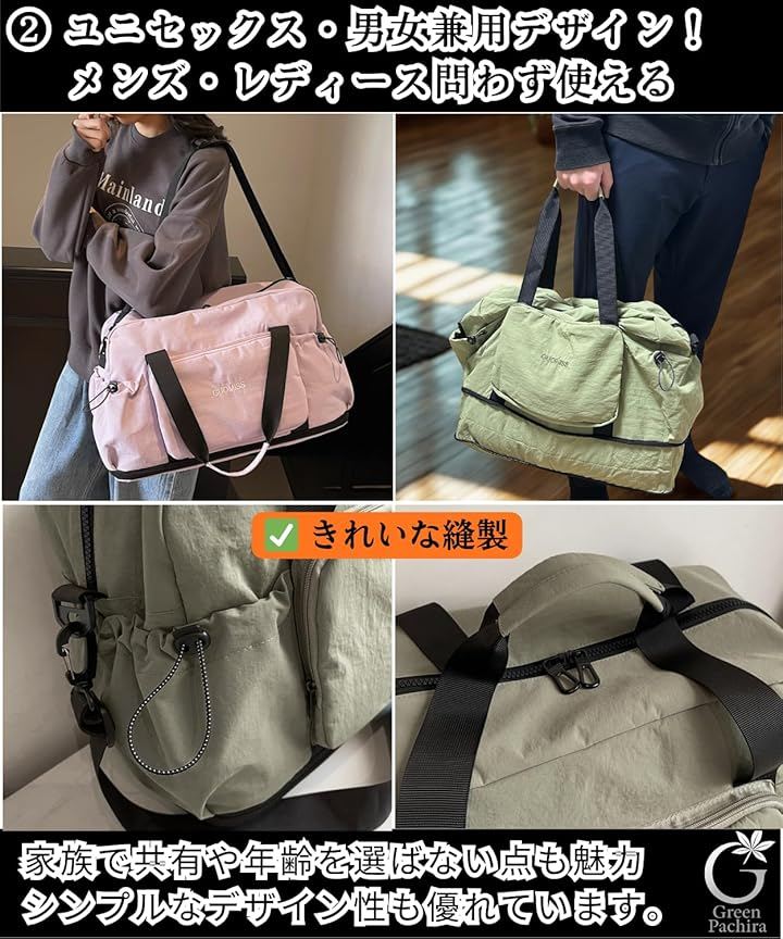 旅行バッグ、入院バッグ、ジムバッグ、修学旅行バッグ、スポーツバッグとしても活躍します。