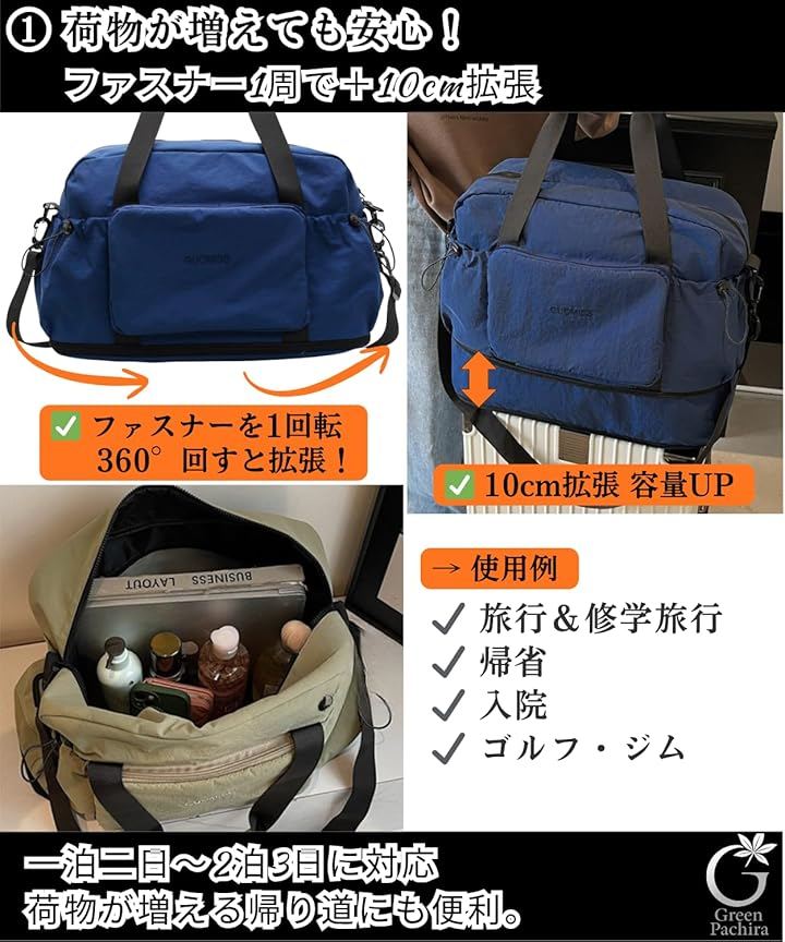 旅行バッグ、入院バッグ、ジムバッグ、修学旅行バッグ、スポーツバッグとしても活躍します。