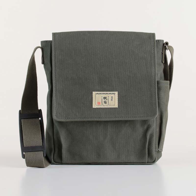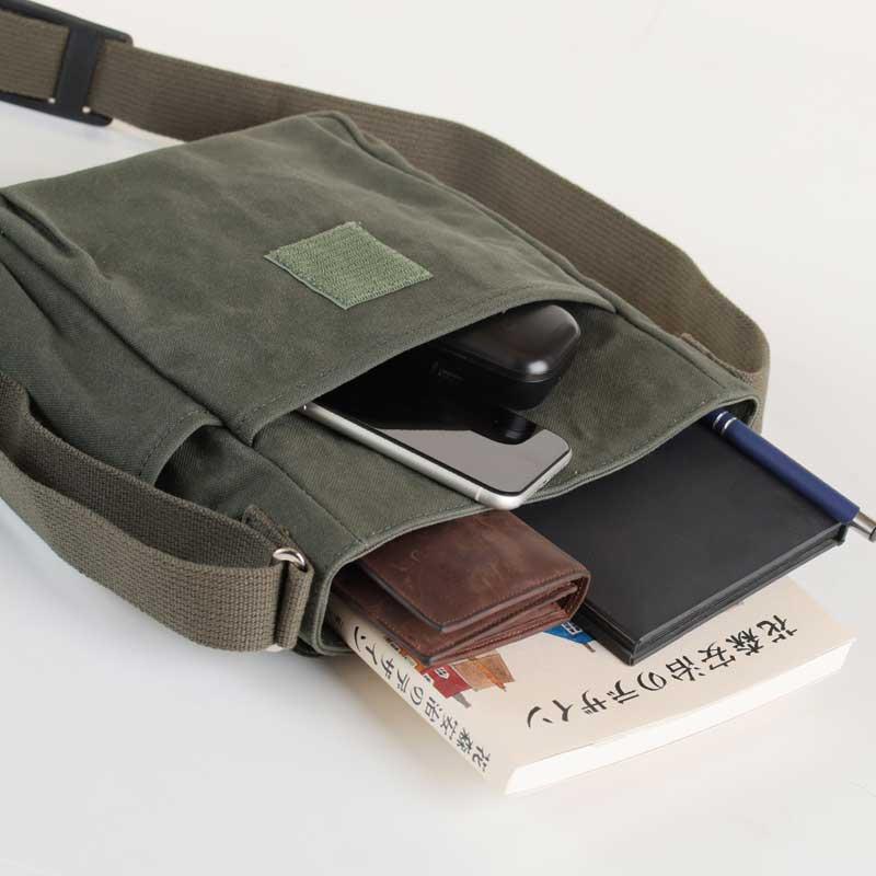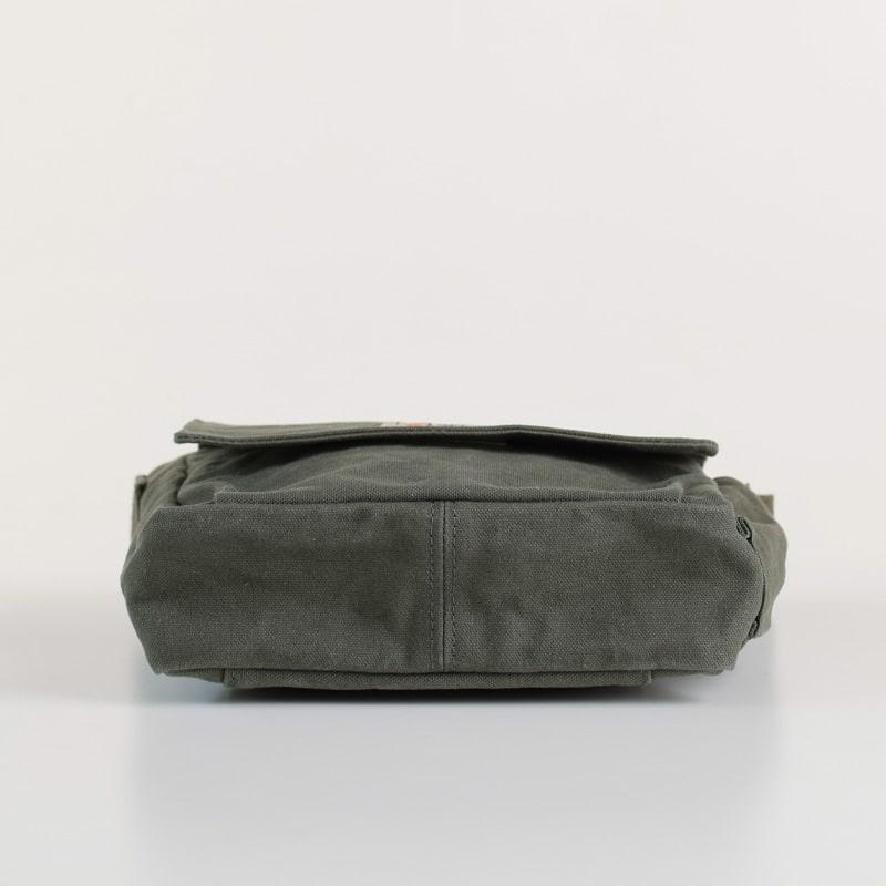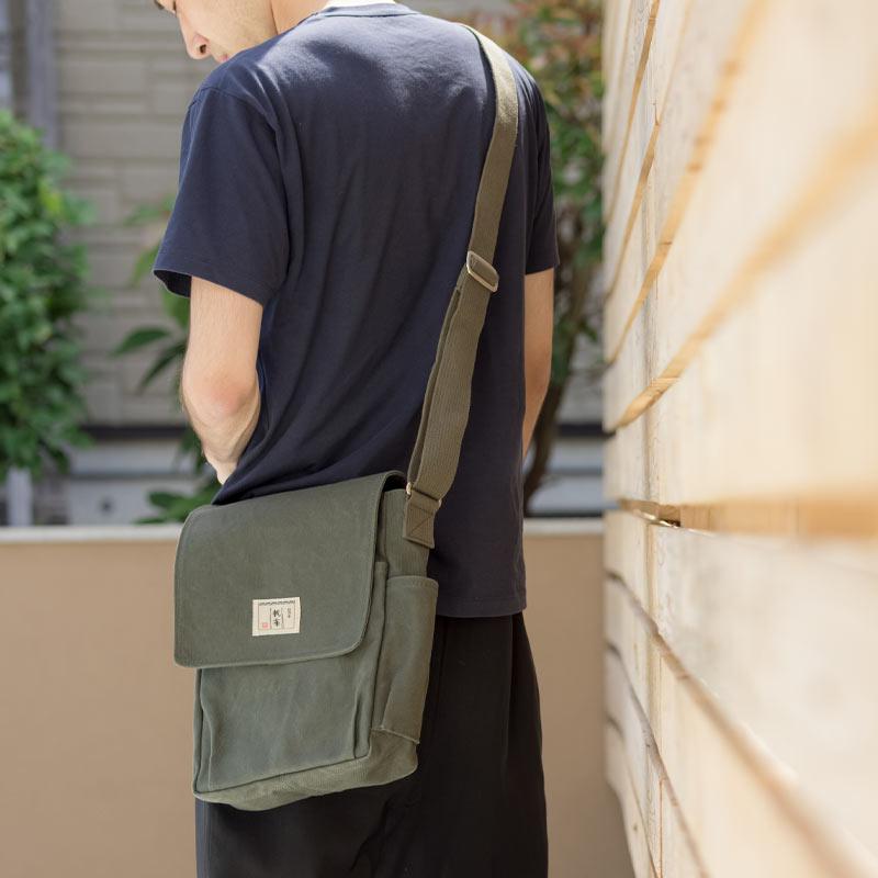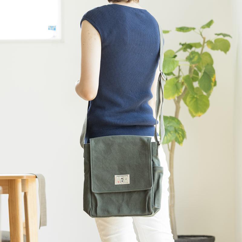 「帆布と言えばかぶせのショルダーバッグ!」というイメージにピッタリの定番のショルダーバッグ。大振りすぎない週刊誌サイズは日々のお出掛けや散策にピッタリのサイズです。近年はスマホの他にタブレットを携帯する方も増えているので、8インチのタブレットが収納可能なサイズ感なので便利です。