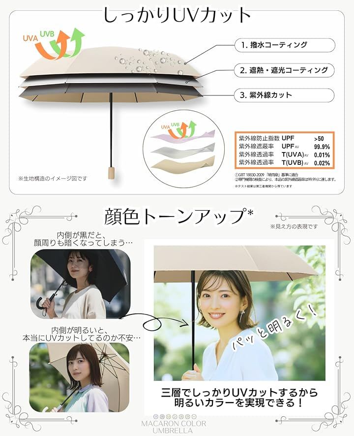 - UPF+50とUVカット機能付きで、晴れた日の日傘としても大活躍。