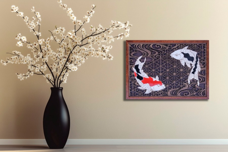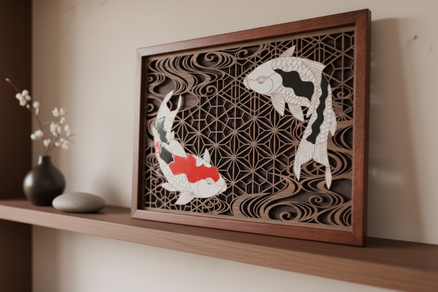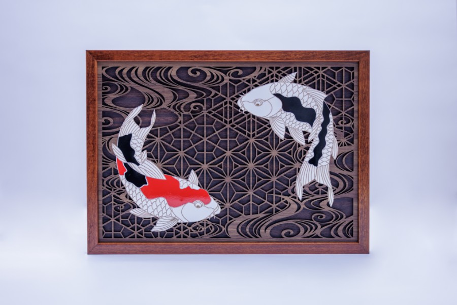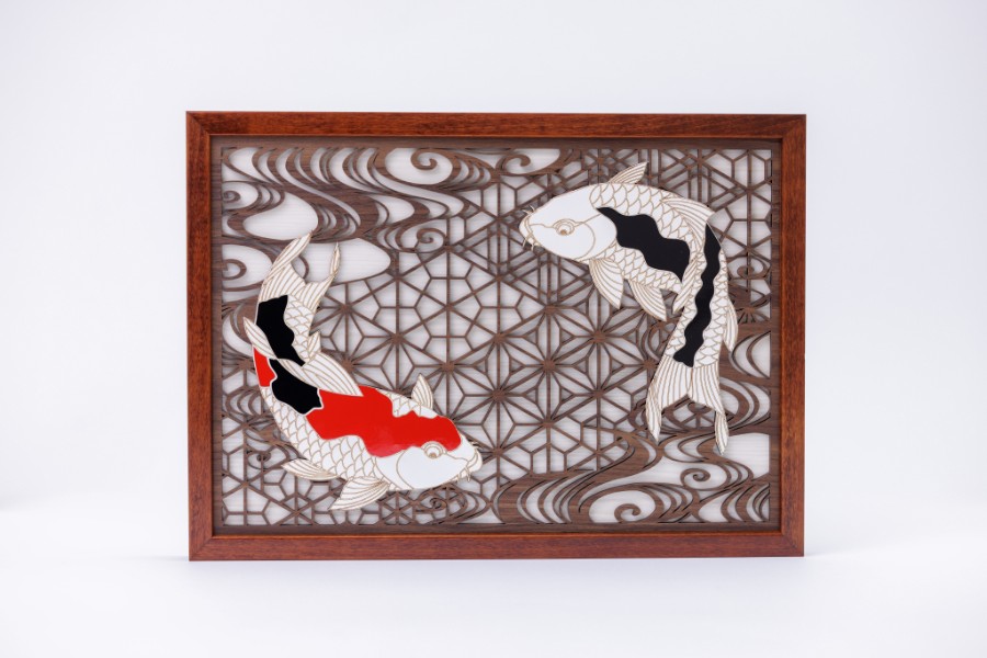 日本の家具産地・福岡県大川市で生まれた木製インテリアアートフレームです。縁起の良い「錦鯉」をモチーフに、組子柄や波文様などの日本の伝統美を、現代の暮らしに合う和モダンデザインで表現しています。