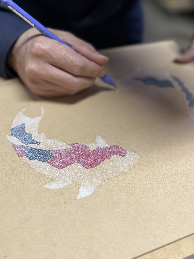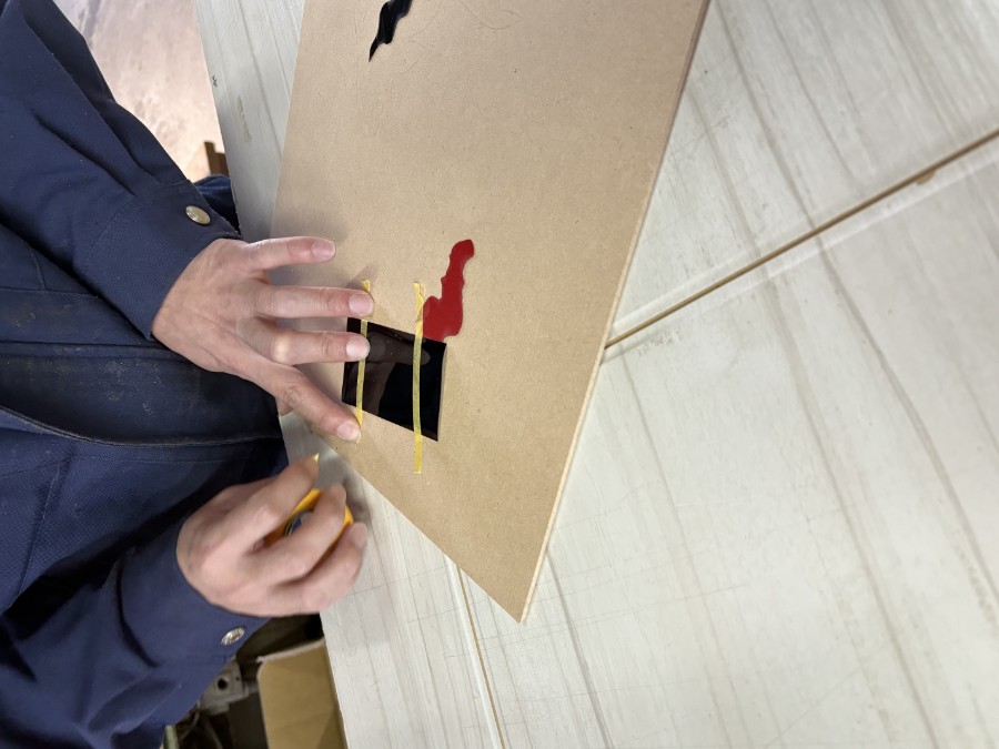 本シリーズには、家具部材製造会社である当社が培ってきた独自の“シート貼り分け技術”を使用しています。複数の木目調やカラーシートを一枚の木質ボード(MDF)に手作業で貼り分け、その上からレーザー加工を施すことで、印刷では再現できない質感の違いと立体感を生み出しています。家具づくりの現場で磨かれた精度と仕上げが活かされた、“技術のあるインテリアアート”として高い評価をいただいています。
