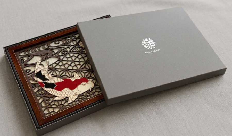 日本製造。木框,飾以組子圖案。現代日式室內壁掛。是慶祝活動和饋贈佳品的完美之選。幸福系列室內藝術畫框:「錦鯉迷你(A4尺寸)」。