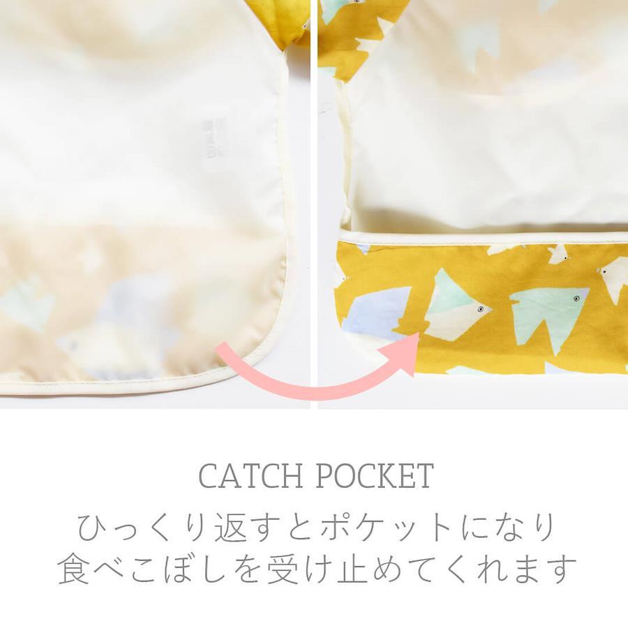 前面下側をくるっと裏返すタイプのポケットで、食べこぼしもしっかりキャッチ。
