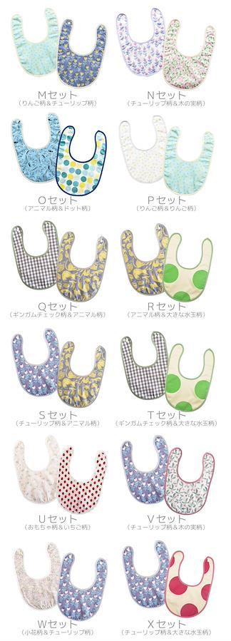 カラー(柄) | Aセット(おもちゃ柄&ストライプ柄) / Bセット(ギンガムチェック柄&チューリップ柄) / Cセット(恐竜柄&ギンガムチェック柄) / Dセット(ギンガムチェック柄&ストライプ柄) / Eセット(アニマル柄&ぞうさん柄) / Fセット(アニマル柄&サーカス柄) / Gセット(チューリップ柄&木の実柄) / Hセット(木の実柄&チューリップ柄) / Iセット(アニマル柄&アニマル柄) / Jセット(雲柄&バード柄) / Kセット(りんご柄&雲柄) / Lセット(ぞうさん柄&アニマル柄) / Mセット(りんご柄&チューリップ柄) / Nセット(チューリップ柄&木の実柄) / Oセット(アニマル柄(&ドット柄) / Pセット(りんご柄&りんご柄) / Qセット(ギンガムチェック柄&アニマル柄) / Rセット(アニマル柄&大きな水玉柄) / Sセット(チューリップ柄&アニマル柄) / Tセット(ギンガムチェック柄&大きな水玉柄) / Uセット(おもちゃ柄&いちご柄) / Vセット(チューリップ柄&木の実柄) / Wセット(小花柄&チューリップ柄) / Xセット(チューリップ柄&大きな水玉柄)