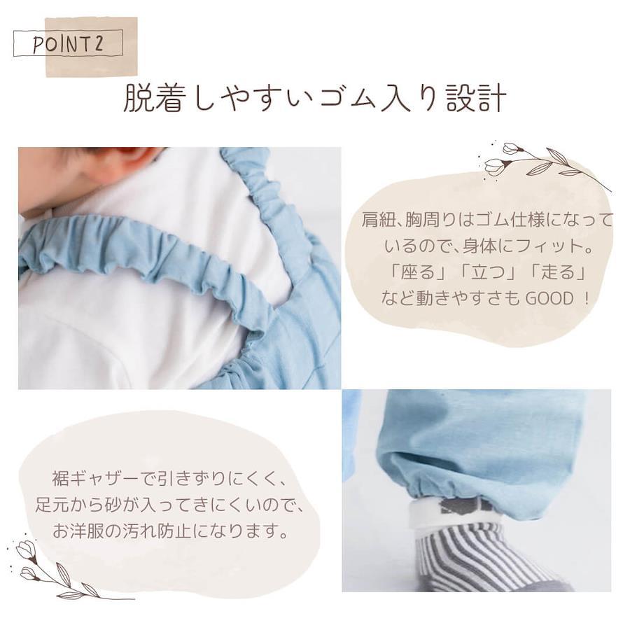 胸まわりや足口がゴムになっていて脱ぎ着しやすいデザイン。