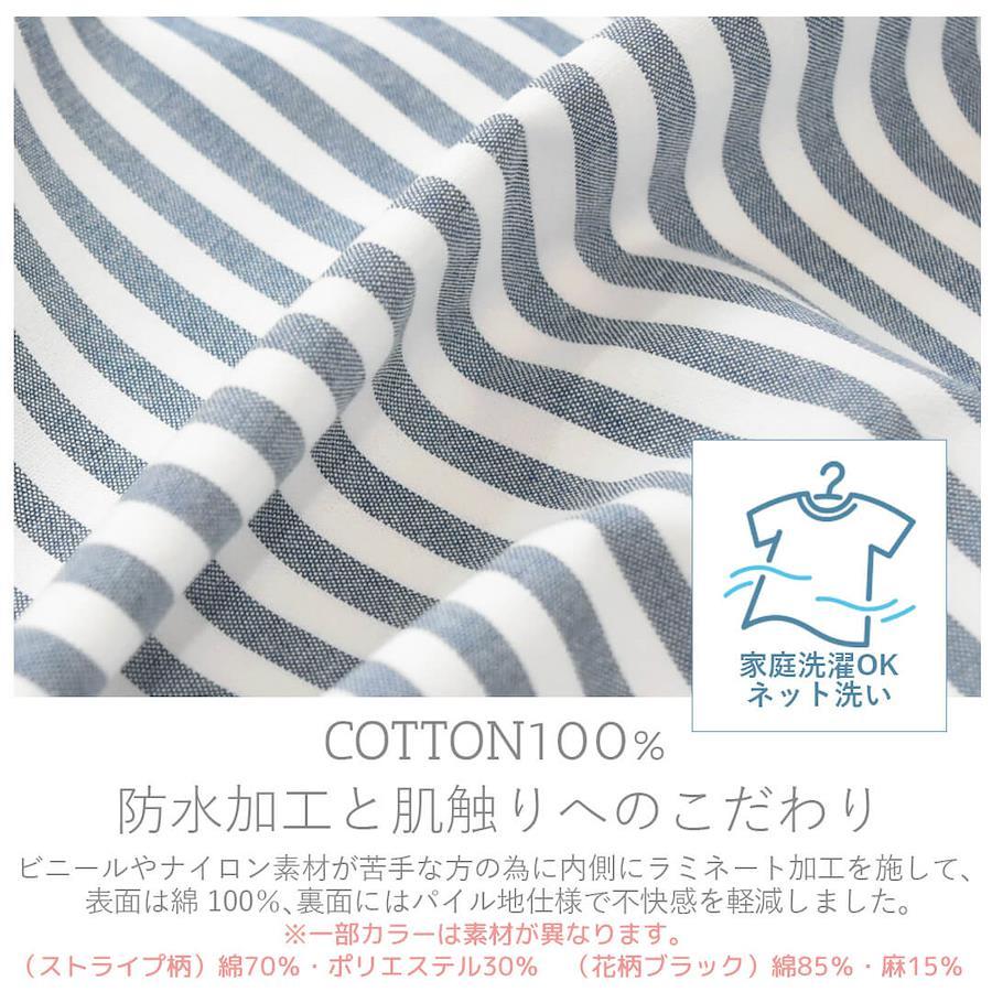 表は綿、裏はラミネート加工のパイル素材で肌触りが優しく、水洗い・洗濯機対応でお手入れ簡単です。