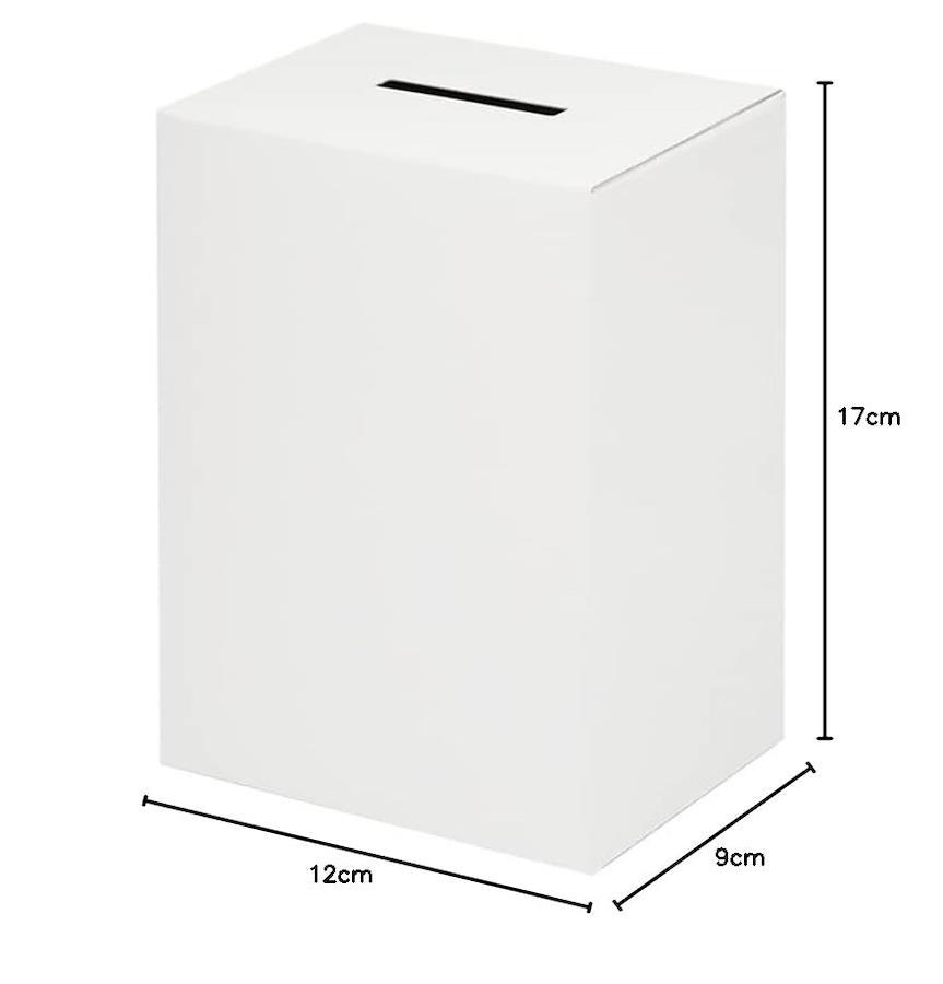 直接書き込みができる白無地の募金箱兼投票箱です。 募金箱・投票箱のラベル付き。 首に掛けるための紐も付属しています。 募金箱・投票箱として使える白無地箱 付属:ラベル2枚(募金箱・投票箱)、首掛け用紐、底板、組み立て説明書 サイズ:幅12cmx奥行9cmx高さ17cm 直接書き込むことができるので、オリジナルのデザインにしてお楽しみいただけます。 製造:日本