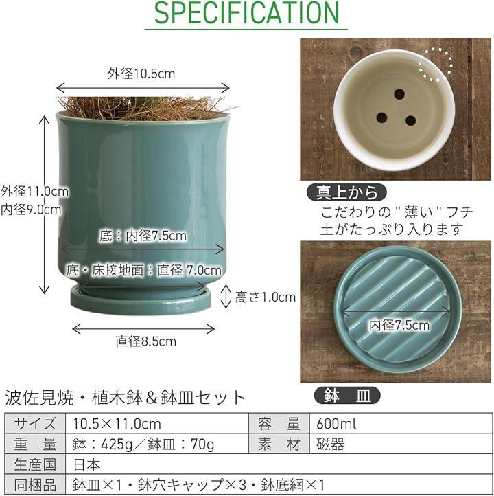 「サイズ」植木鉢…直径:10.5cm,高さ:11.0cm,重量425g,容量600ml,3.5号鉢 鉢皿…直径8.5cm,高さ1.0cm,重量70g 付属品…鉢穴キャップx3個,鉢底網x1個,磁器製。