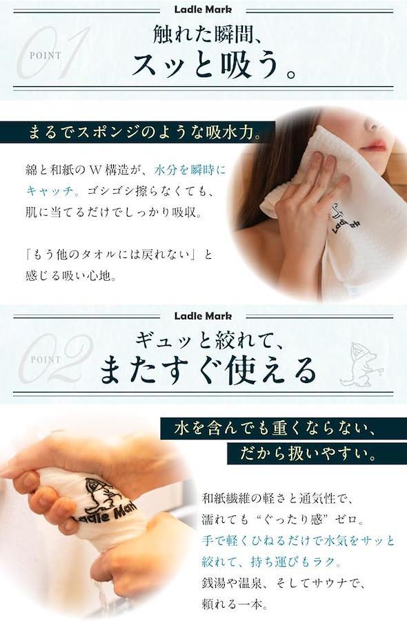 泉州タオルの伝統技術と、綿85%+和紙15%の新素材を組み合わせた「Ladle Mark ハイロタオル」は、サウナ・温泉シーンに特化したタオルです。
