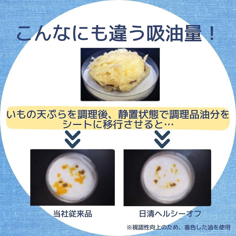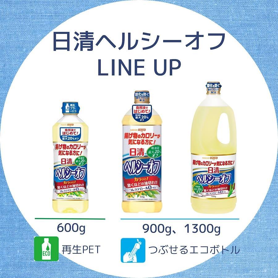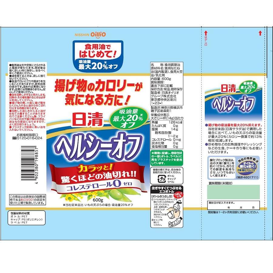 日清ヘルシーオフは、揚げ物のカロリー低減を訴求した業界初の食用油です。調理品(揚げ物)の油分を、通常の食用油に比べて最大20%抑制※します。(カロリー換算で13%オフ)。大豆と菜種がベースでコレステロール0(ゼロ)。衣に含まれる油分が少なく、カラッとした油切れのよさを実感できます。揚げ物のカロリーが気になる方へおすすめの商品です。※当社従来品比いもの天ぷらの場合です。