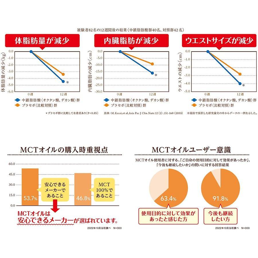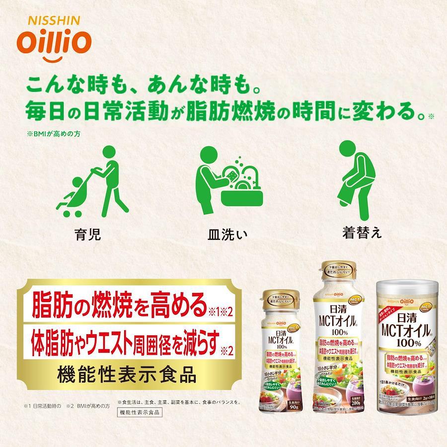 日清MCTオイルは、中鎖脂肪酸油100%の食用油です。無味無臭ですので、普段の食事や飲み物に混ぜたりかけたりするたけで、美容と運動に「良質なエネルギー」を、手軽に補給することができます。機能性食品であり、BMIが高めの方の体脂肪や内臓脂肪、ウエストサイズを減らします。