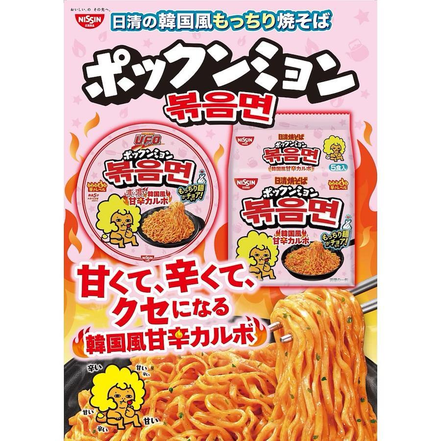 もっちり麺×甘辛ソースがクセになる! もっちり麺の韓国風焼そば「ポックンミョン」が日清焼そばU.F.O.から新登場!第1弾は韓国で人気のカルボ。発酵唐辛子の風味とチーズのまろやかさが効いた甘辛ソースにもっちり麺が絡む、やみつきな味わい!