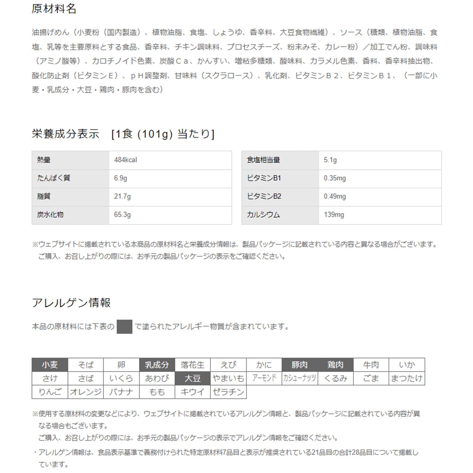油揚げめん(小麦粉(国内製造)、植物油脂、食塩、しょうゆ、香辛料、大豆食物繊維)、ソース(糖類、植物油脂、食塩、乳等を主要原料とする食品、香辛料、チキン調味料、プロセスチーズ、粉末みそ、カレー粉)/加工でん粉、調味料(アミノ酸等)、カロチノイド色素、炭酸Ca、かんすい、増粘多糖類、酸味料、カラメル色素、香料、香辛料抽出物、酸化防止剤(ビタミンE)、pH調整剤、甘味料(スクラロース)、乳化剤、ビタミンB2、ビタミンB1、(一部に小麦・乳成分・大豆・鶏肉・豚肉を含む)