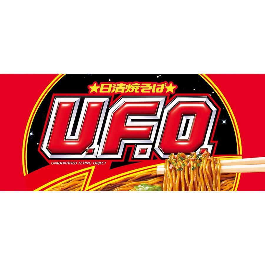 1976年に発売したロングセラー旨さ凝縮、濃い濃いソース! が旨い、日清焼そばU.F.O.コシの強さが特徴の食べごたえのある中太麺に、ローストした香りが立ち、ソースとポークの旨味・酸味・そしてスパイス感がしっかりと堪能できる濃厚ソースが特徴です。具には、大切りキャベツに炒めた豚肉を使用しコクをアップ。別添で青のりと紅生姜のふりかけ付です。お湯の目安量 460ml