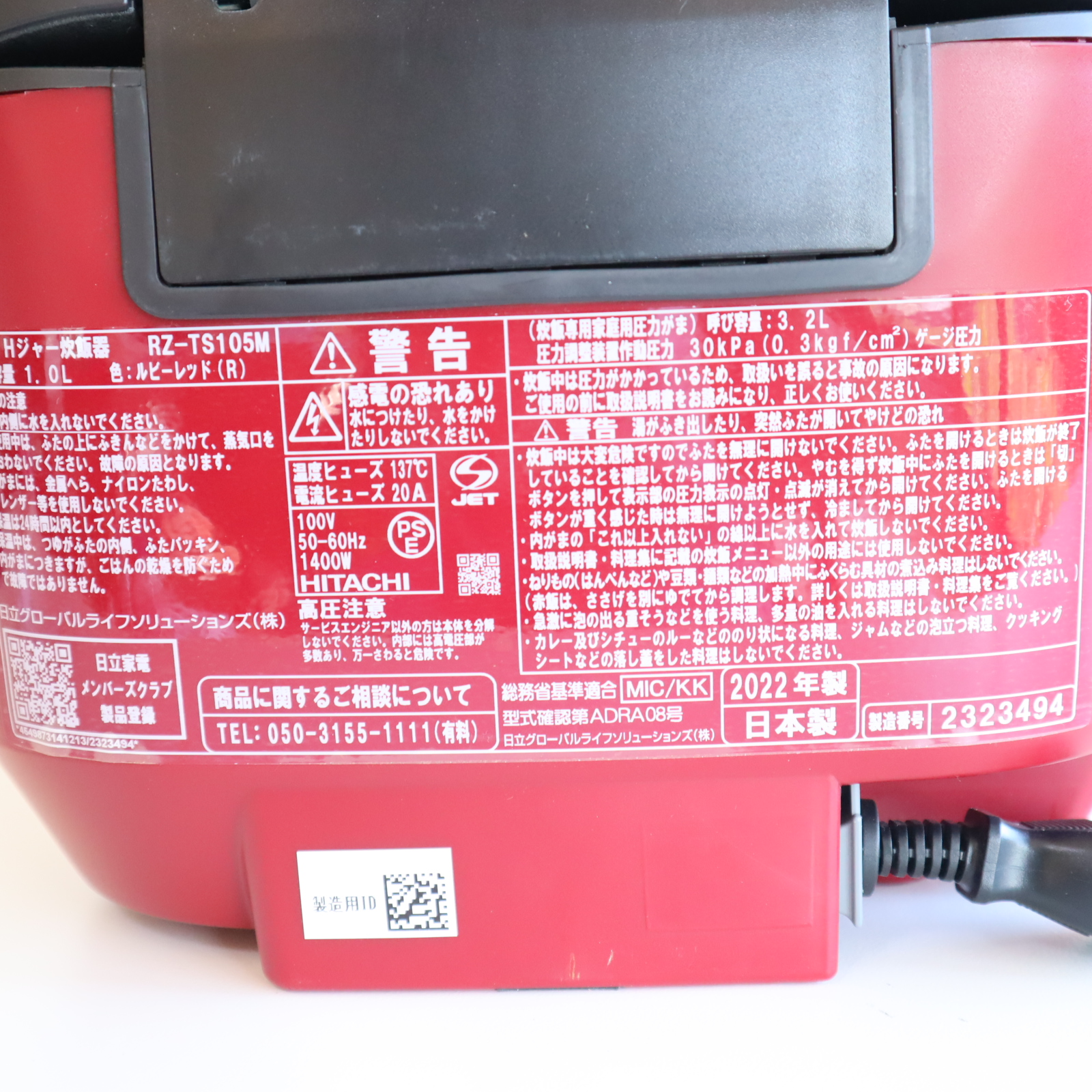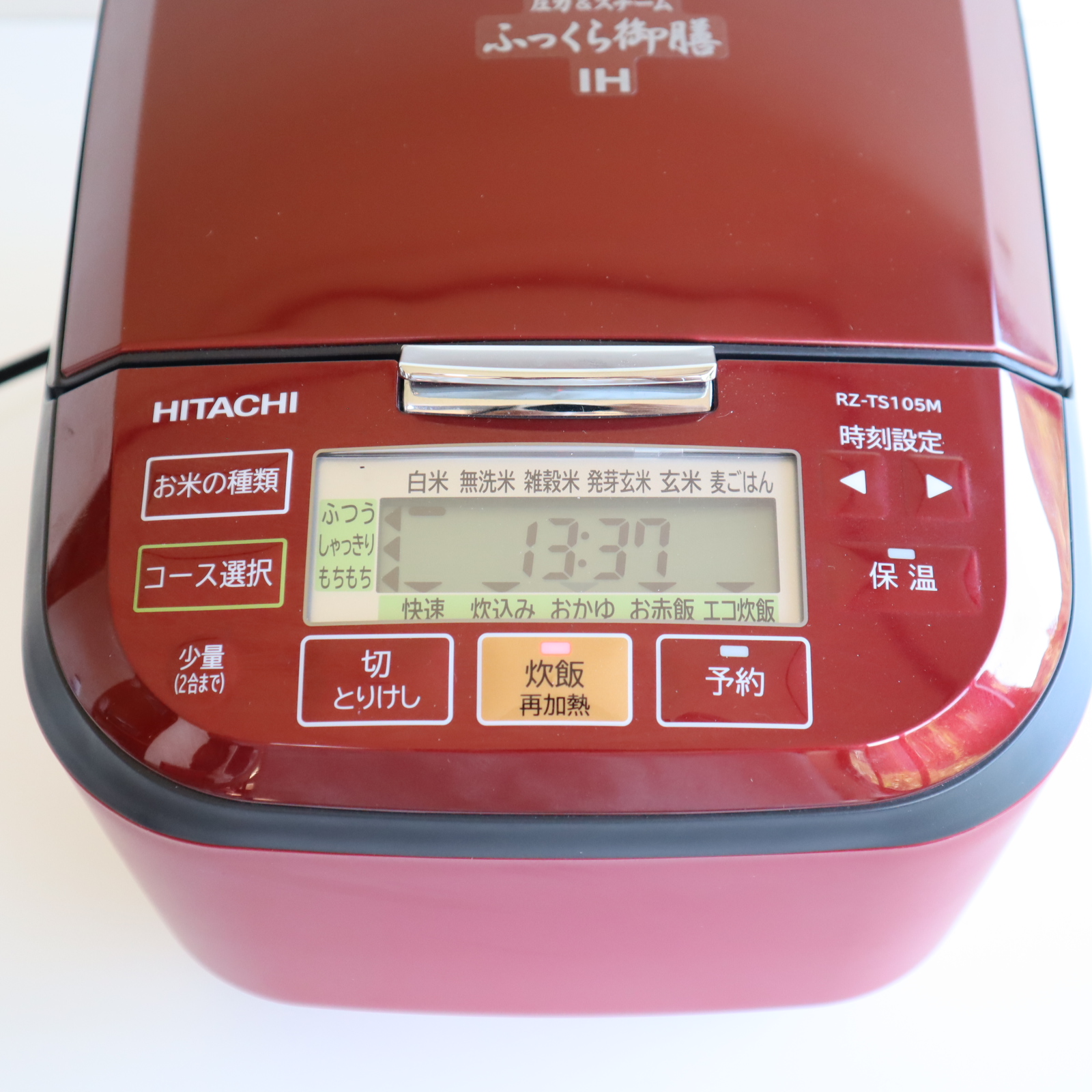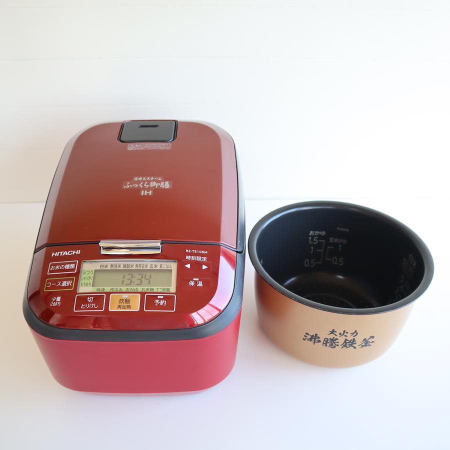 【詳細】■ 商品名・モデル:ふっくら御膳 RZ-TS105M■ ブランド:HITACHI(日立)■ カラー:ルビーレッド(R)■ 容量:5.5合炊き■ 年式:2022年製■ 状態:- 動作確認済み- 目立った傷や汚れなし(多少の使用感あり)- 内釜・内ぶた・本体ともにきれいな状態です■ 付属品:内釜・内ぶた一式(圧力スチームユニット)■ タイプ:圧力スチームIH炊飯器■ 生産国:日本製