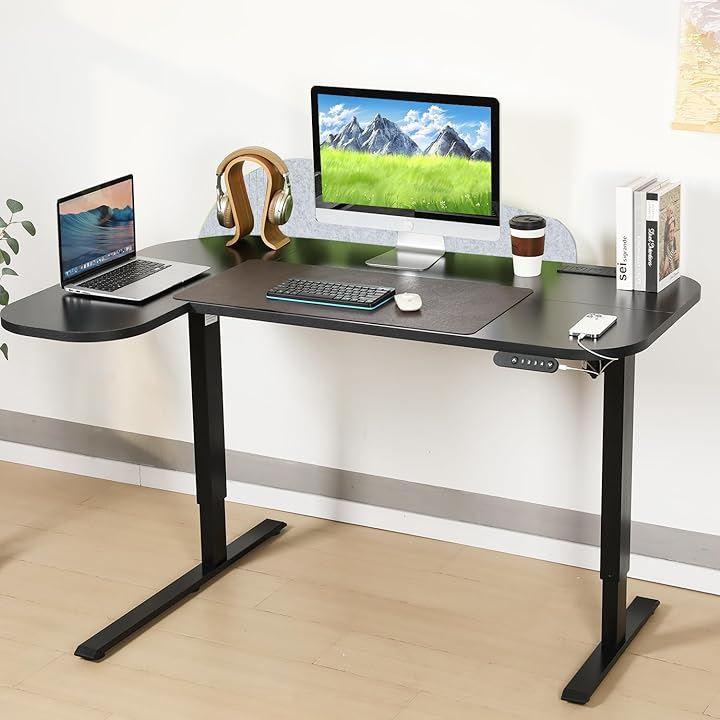「商品仕様」*天板サイズ:約幅150CMx奥行100CM(左)68CM (右) *天板は3分割 *本体重量:約39KG *耐荷重80KG *高さ調節範囲:69-115CM(厚さ:2CM、高さ71-117CM)*材料:化粧合板、鋼鉄合金材料