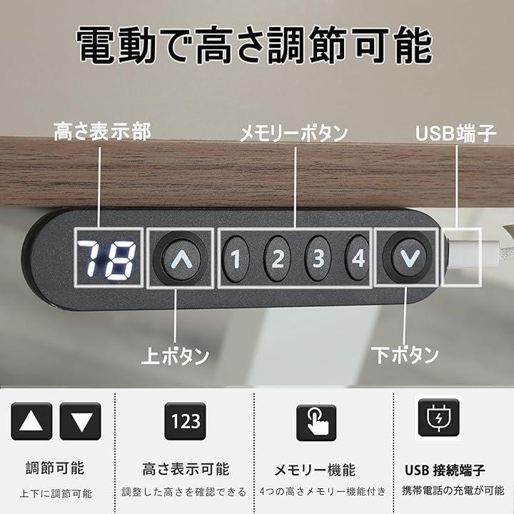 「電気で高さ調節 」この机は、「⮝・⮟」ボタンを押すと、高さ調整の範囲は69~115cmで、調整後の高さは71~117cmです。