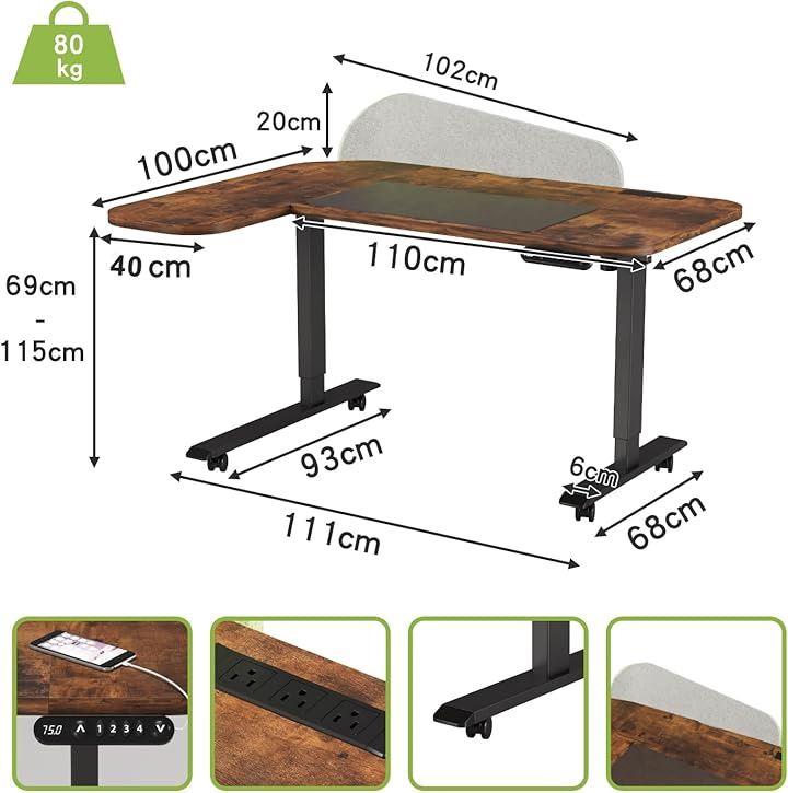 「商品仕様」*天板サイズ:約幅150CMx奥行100CM(左)68CM (右) *天板は3分割 *本体重量:約39KG *耐荷重80KG *高さ調節範囲:69-115CM(厚さ:2CM、高さ71-117CM)*材料:化粧合板、鋼鉄合金材料