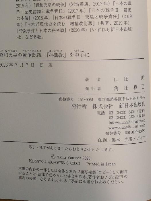 e02-260315004006015-000昭和天皇の戦争認識──『拝謁記』を中心に 新日本出版社 山田 朗日本近現代史研究で定評のある著者が、完結した『昭和天皇拝謁記』を中心に論じた歴史認識論。かなり率直な天皇の言葉も記された『拝謁記』に分け入り、天皇の戦争認識、対日講和条約発効時の「お言葉」問題、天皇の憲法に対する考え、アジア観や米国観などを鋭く分析。象徴天皇制の問題点や司馬遼太郎についても論究。9784406067560<%% SHIPPING %%>表紙上下端部に、ヨレ、天地小口にシミ、があります。本は使用感少なく、おおむね良好な状態です。※注意事項※■商品・状態はコンディションガイドラインに基づき、判断・出品されております。■付録等の付属品がある商品の場合、記載されていない物は『付属なし』とご理解下さい。