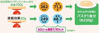 この「昭和 蒟蒻効果 400g」は、健康とおいしさを兼ね備えた商品です。蒟蒻(コンニャク)由来のグルコマンナンの高い吸水性を持つ特性を生かし、カロリー、糖質ともに4分の1カットを実現した、必要摂取量の約2分の1日分の食物繊維も摂取できるパスタとなっております。