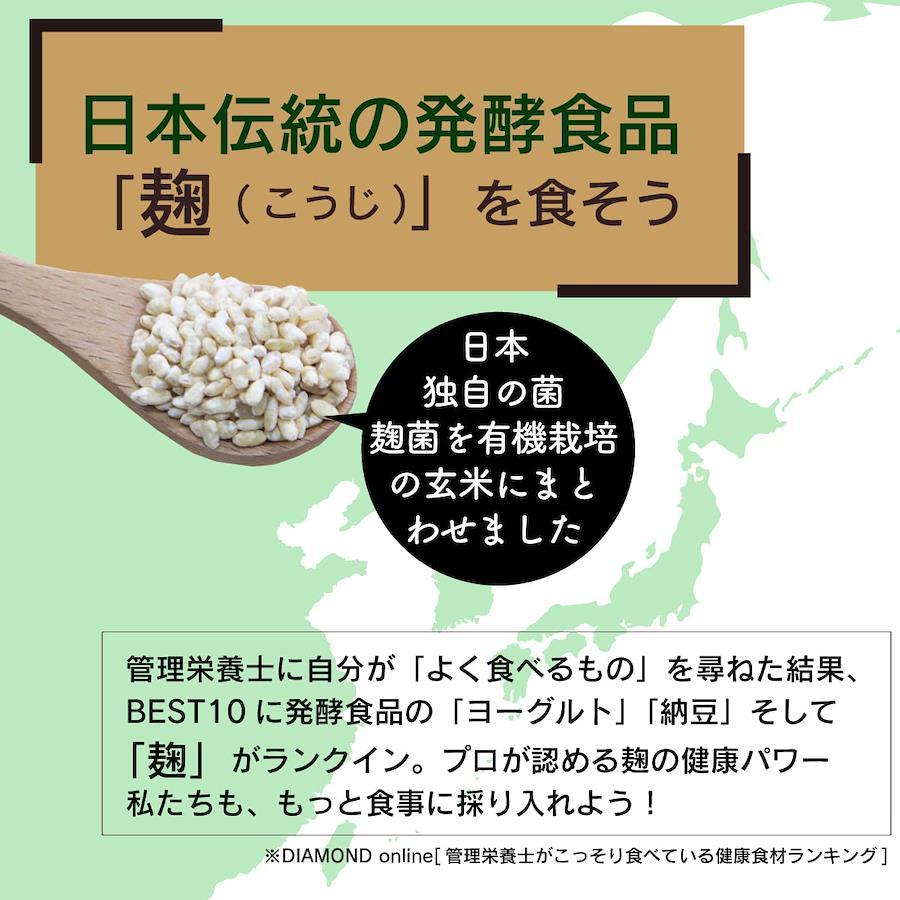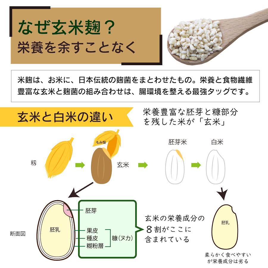 ◎野菜の漬物も簡単にできます。野菜の漬物も簡単にできます。天然の酵素ドリンク、甘酒(あまざけ)や 麹水が手作りできます。ご自宅のミキサーなどを使えば、手作りの玄米スムージーも簡単。こうじあまざけの甘さの正体は、天然の「オリゴ糖」。玄米麹ならではの、玄米に含まれる食物繊維やミネラルが加わって、腸活にぴったりのドリンクができあがります。【重要】メーカーによる商品リニューアルに伴いパッケージ(内容量も含む)変更が行われた場合、新パッケージでお届け致します事ご了承願います。