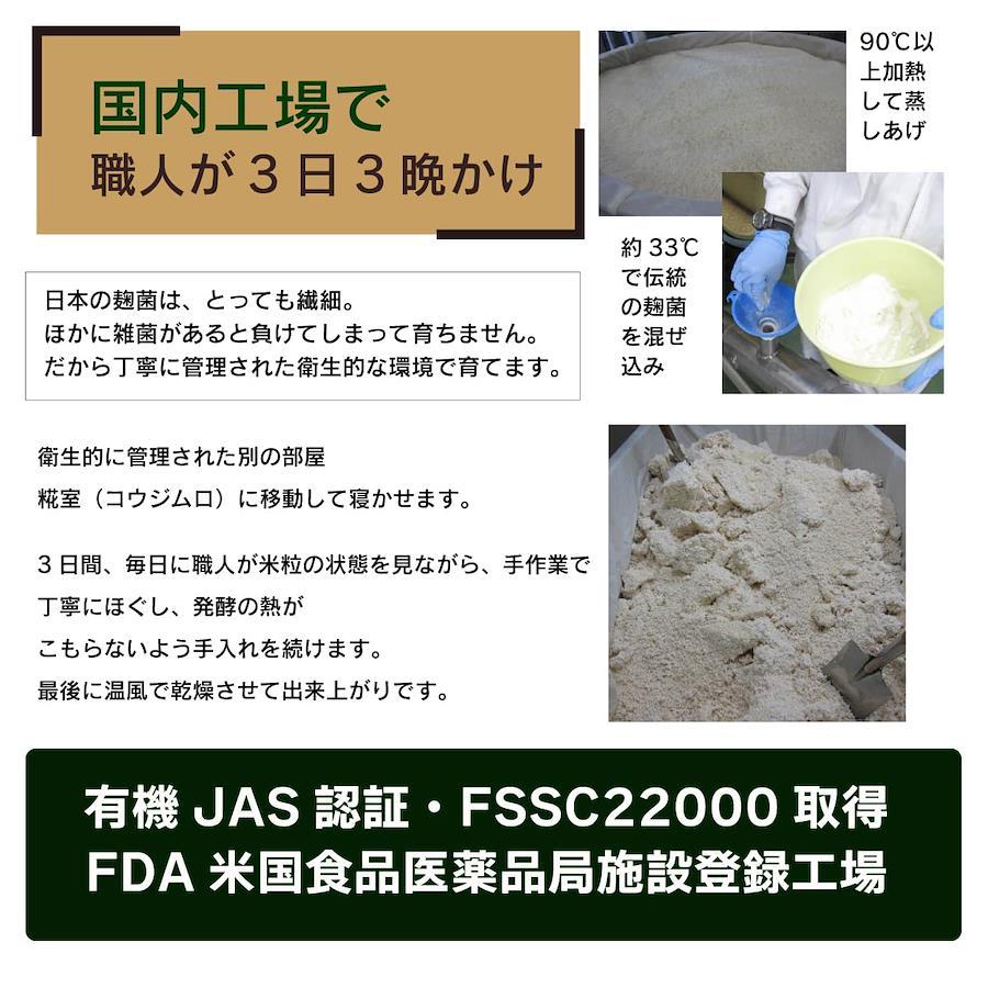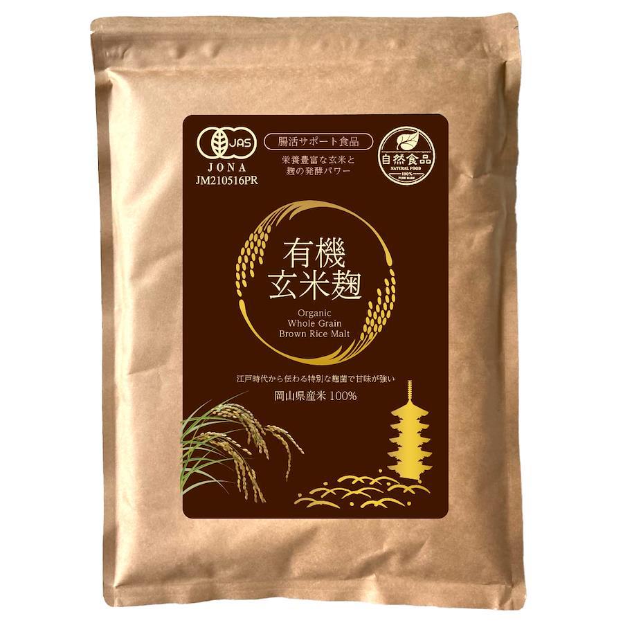 ◎岡山県産 オーガニック米使用 江戸時代から伝わる麹菌で手作りした、 有機JAS認証の玄米麹(乾燥・粒タイプ)500g◎旨味調味料不要な、しょうゆ麹や塩こうじ、手作りの無添加みそ(玄米麹味噌)、玉ねぎ塩麹など、いつものお料理に人さじで美味しくて体に優しい、日本伝統の発酵食品が楽しめます。◎お肉やお魚にも、有機玄米麹で作った、塩こうじや醤油麹を加えて寝かせれば、旨味アップ、お肉が柔らかくなります。◎野菜の漬物も簡単にできます。◎天然の酵素ドリンク、甘酒(あまざけ)や 麹水が手作りできます。◎ご自宅のミキサーなどを使えば、手作りの玄米スムージーも簡単。◎こうじあまざけの甘さの正体は、天然の「オリゴ糖」。玄米麹ならではの、玄米に含まれる食物繊維やミネラルが加わって、腸活にぴったりのドリンクができあがります。