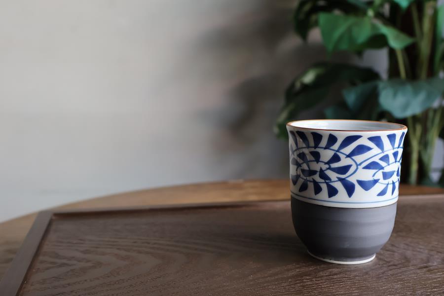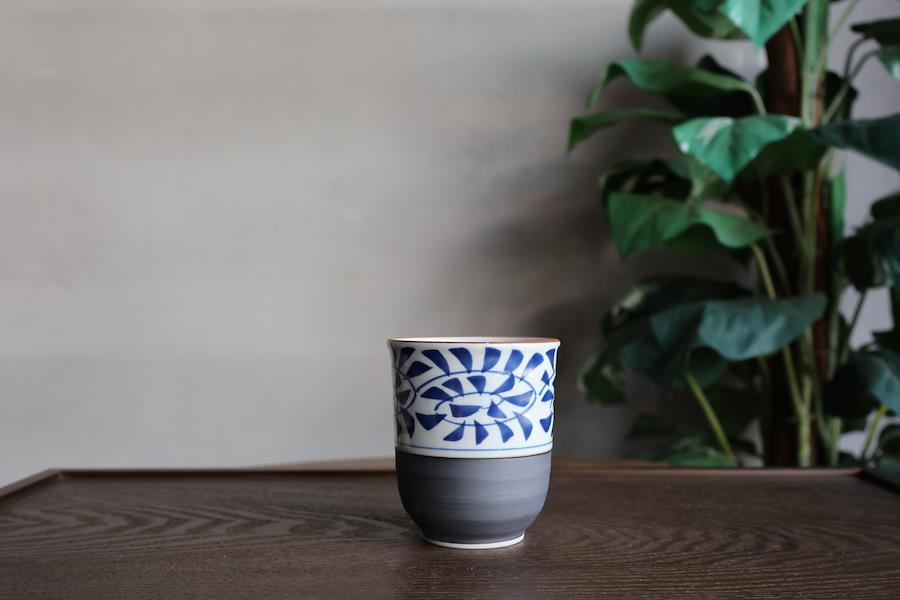 古くから愛されてきた伝統的な有田焼 唐草模様の湯呑です。他に色違い(赤)があり、ペアで使っていただくのもおすすめです。同じデザインで飯碗もございます。