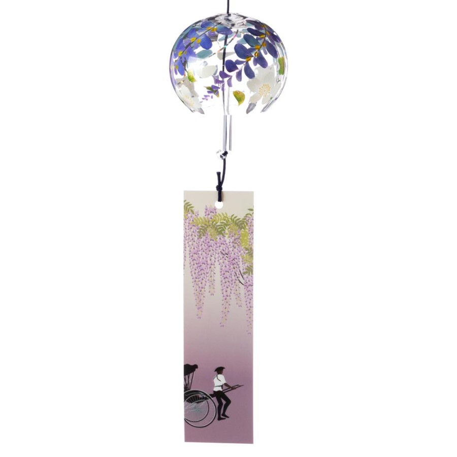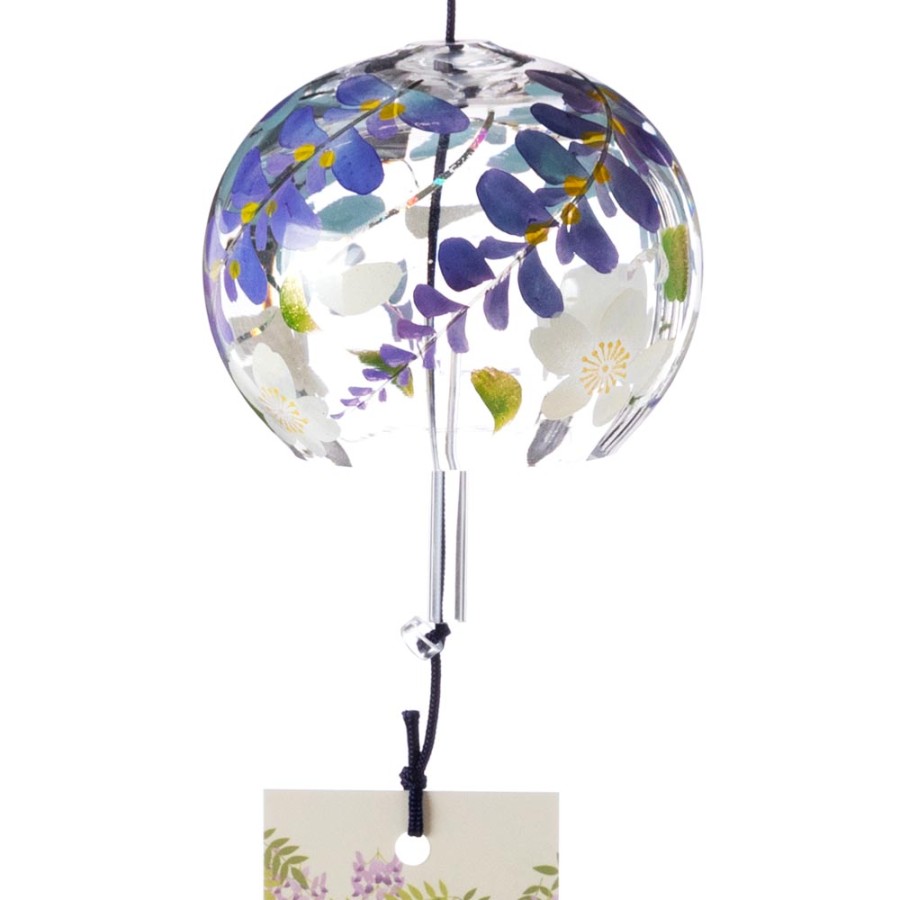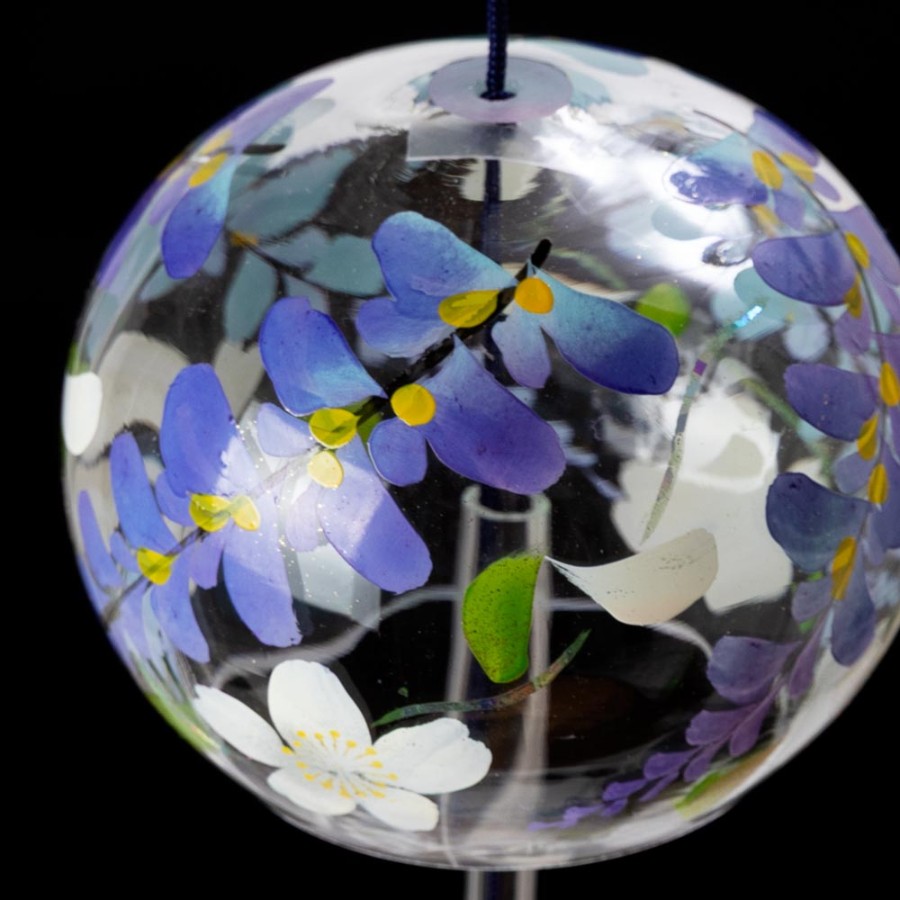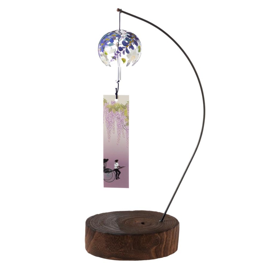クリスタルガラスを使用した、ぬくもりのある透明感が特徴の風鈴に、その透明感を生かした柄を内側にさりげなく描いた、立体感のある柄のガラス風鈴。そこに、風鈴を吊るすスタンドをセットにしました。スタンドの台は桐材から作っていますので、木の暖かみが感じられる素朴な雰囲気が特徴です。軸は丈夫な鉄製で、安定して風鈴を吊るせます。