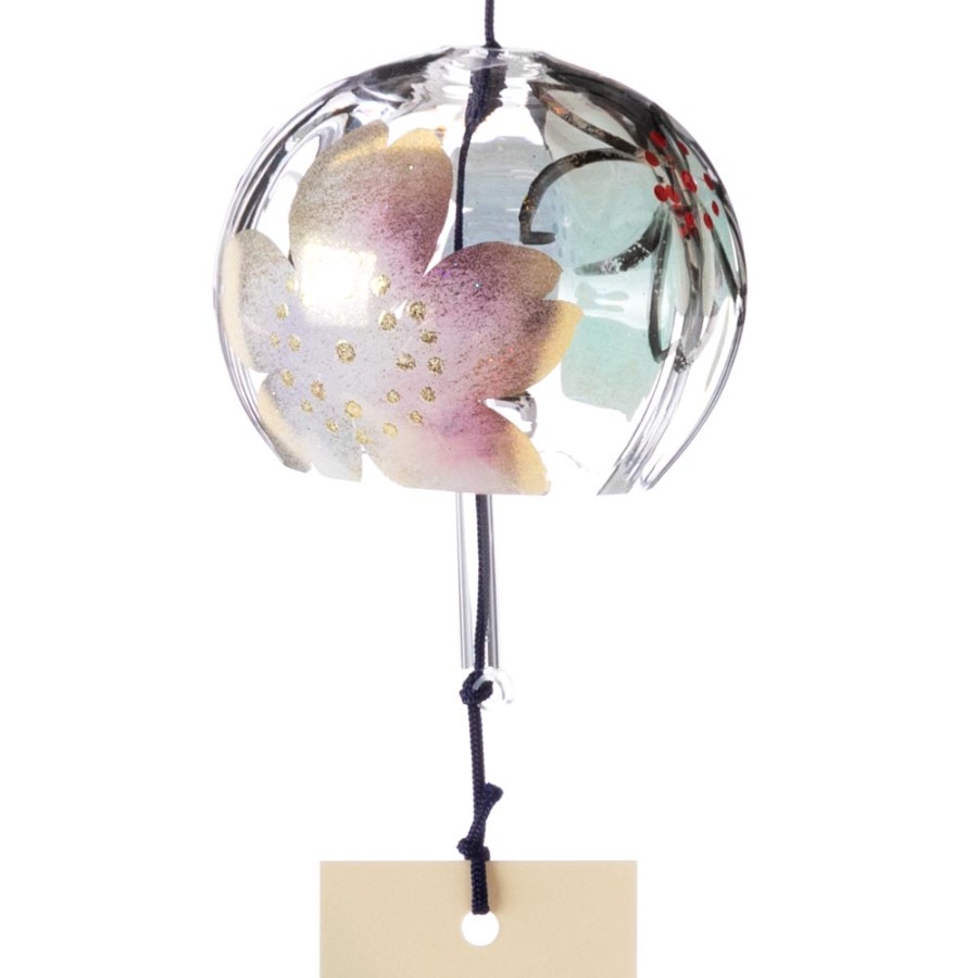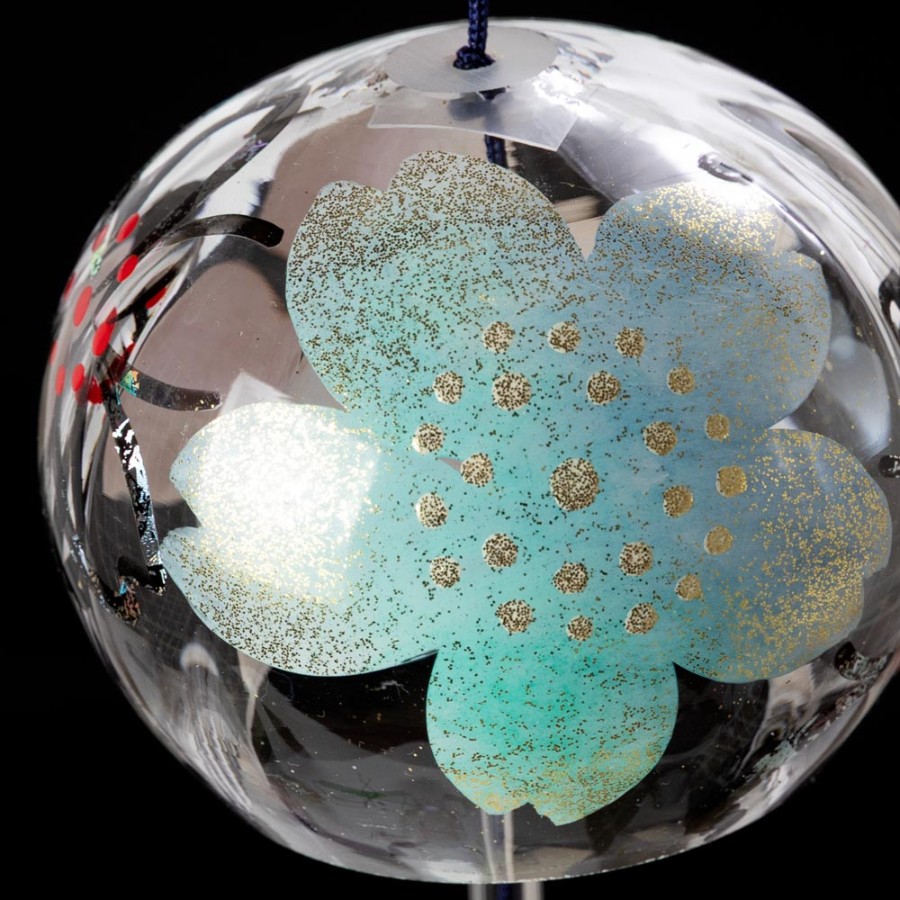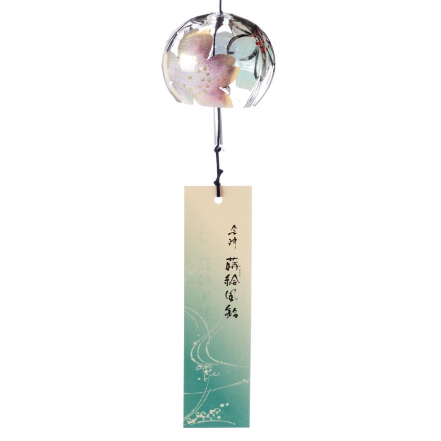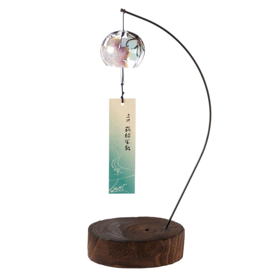 クリスタルガラスを使用した、ぬくもりのある透明感が特徴の風鈴に、その透明感を生かした柄を内側にさりげなく描いた、立体感のある柄のガラス風鈴。そこに、風鈴を吊るすスタンドをセットにしました。スタンドの台は桐材から作っていますので、木の暖かみが感じられる素朴な雰囲気が特徴です。軸は丈夫な鉄製で、安定して風鈴を吊るせます。